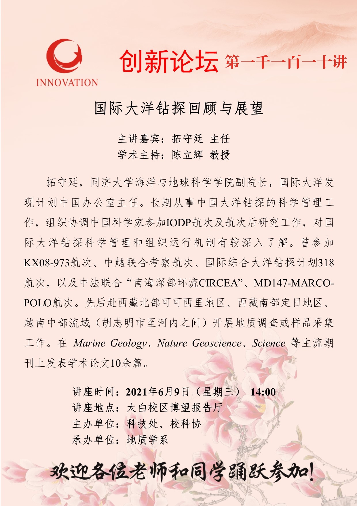 拓守廷 主任 bat365正版唯一官网创新论坛第一千一百一十讲:国际大洋钻探回顾与展望 讲座时间 2021年6月9日(星期三) 14:00 讲座地点 太白校区博望报告厅 讲座人介绍 拓守廷 主任 讲座内容