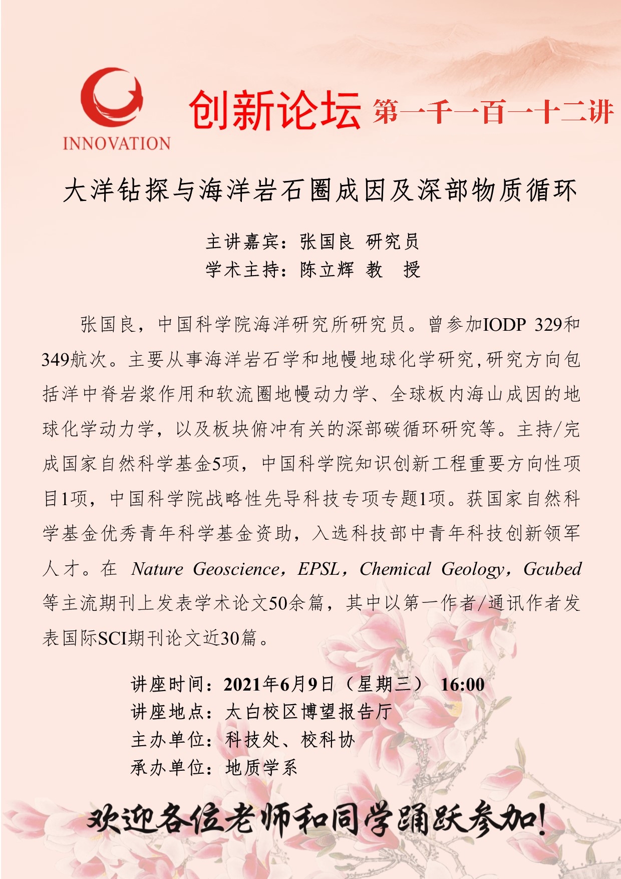 张国良 研究员 bat365正版唯一官网创新论坛第一千一百一十二讲:大洋钻探与海洋岩石圈成因及深部物质循环 讲座时间 2021年6月9日(星期三) 16:00 讲座地点 太白校区博望报告厅 讲座人介绍 张国良 研究员 讲座内容