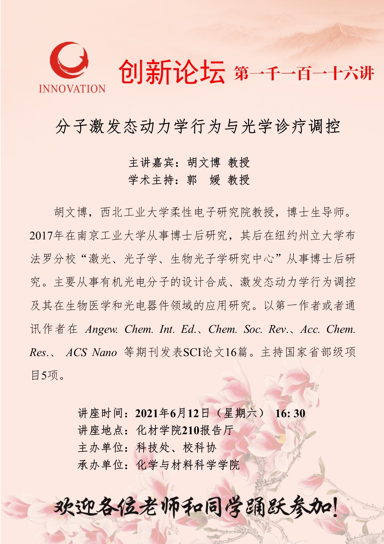 胡文博 教授 bat365正版唯一官网创新论坛第一千一百一十六讲:分子激发态动力学行为与光学诊疗调控 讲座时间 2021年6月12日(星期六) 16:30 讲座地点 化材学院210报告厅 讲座人介绍 胡文博 教授 讲座内容