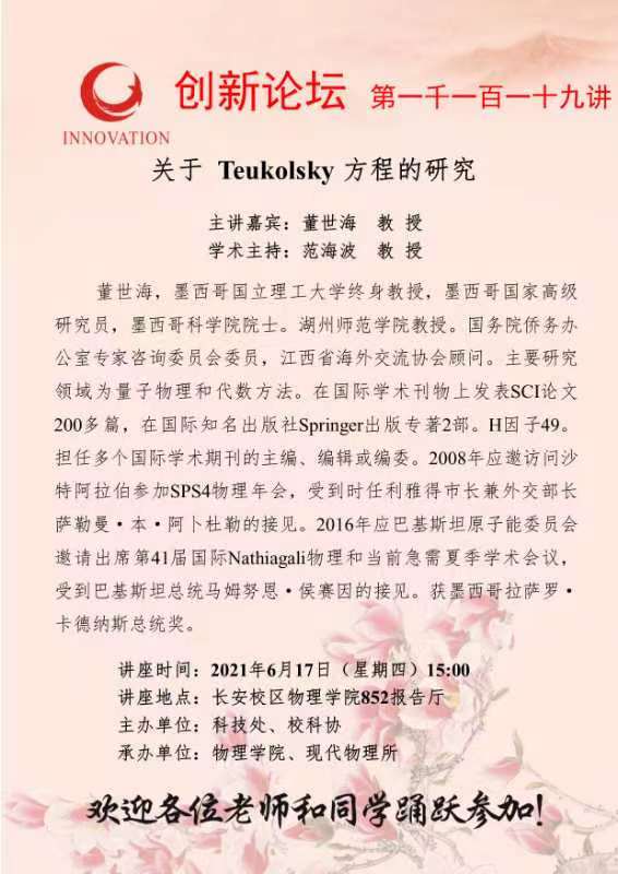 董世海 教 授 bat365正版唯一官网创新论坛第一千一百一十九讲:关于 Teukolsky 方程的研究 讲座时间 2021年6月17日(星期四)15:00 讲座地点 长安校区物理学院852报告厅 讲座人介绍 董世海 教 授 讲座内容