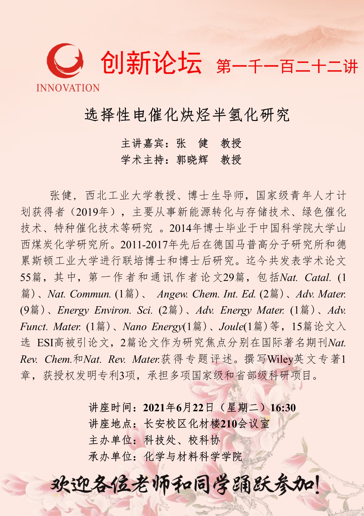 张 健 教授 bat365正版唯一官网创新论坛第一千一百二十二讲:选择性电催化炔烃半氢化研究 讲座时间 2021年6月22日(星期二)16:30 讲座地点 长安校区化材楼210会议室 讲座人介绍 张 健 教授 讲座内容