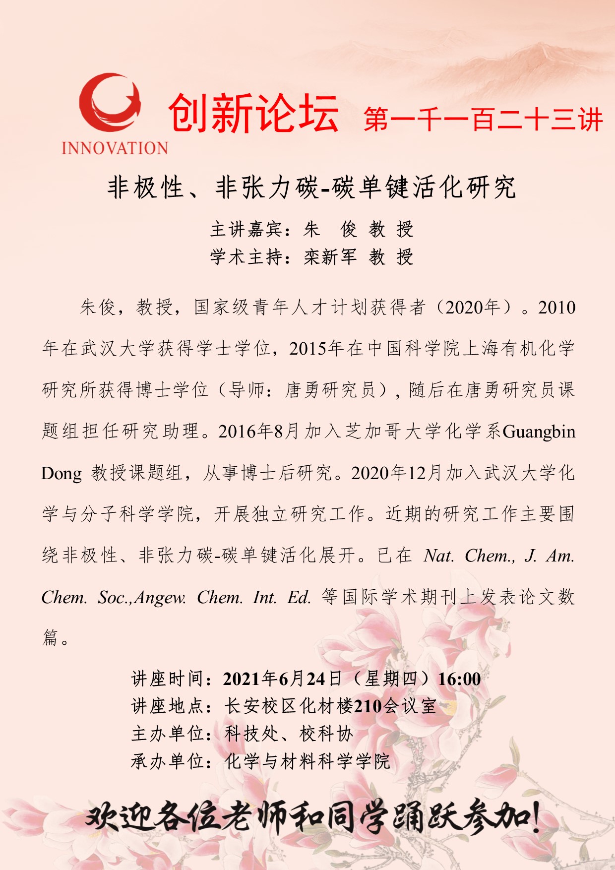 朱 俊 教 授 bat365正版唯一官网创新论坛第一千一百二十三讲:非极性、非张力碳-碳单键活化研究 讲座时间 2021年6月24日(星期四)16:00 讲座地点 长安校区化材楼210会议室 讲座人介绍 朱 俊 教 授 讲座内容