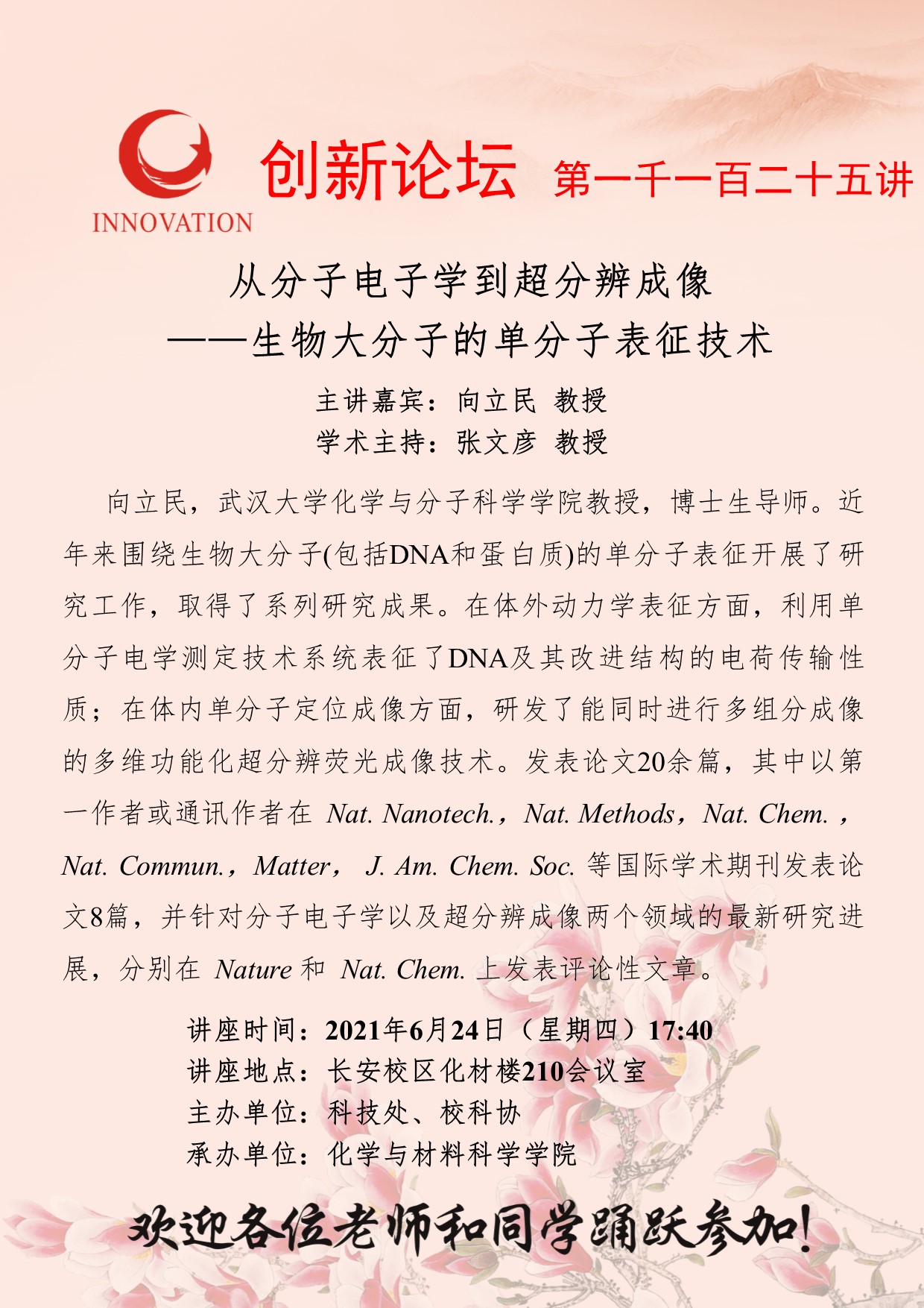 向立民 教授 bat365正版唯一官网创新论坛第一千一百二十五讲:从分子电子学到超分辨成像——生物大分子的单分子表征技术 讲座时间 2021年6月24日(星期四)17:40 讲座地点 长安校区化材楼210会议室 讲座人介绍 向立民 教授 讲座内容