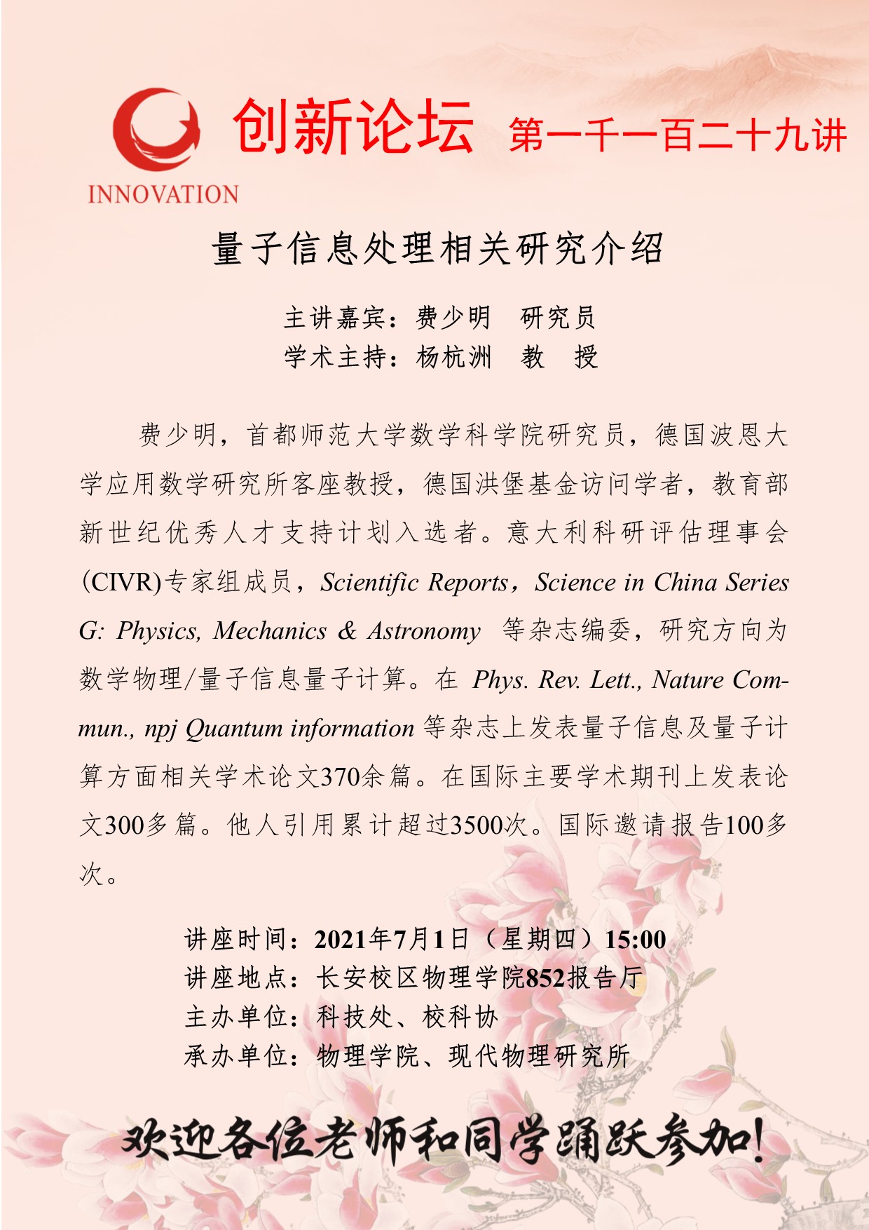 费少明 研究员 bat365正版唯一官网创新论坛第一千一百二十九讲:量子信息处理相关研究介绍 讲座时间 2021年7月1日(星期四)15:00 讲座地点 长安校区物理学院852报告厅 讲座人介绍 费少明 研究员 讲座内容