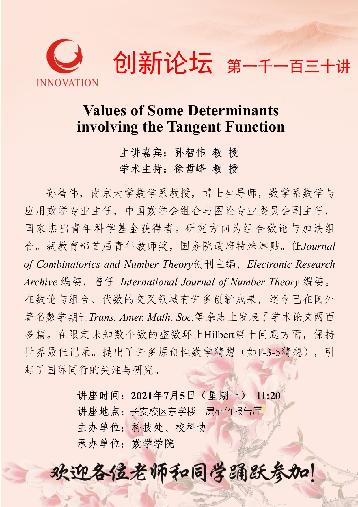 孙智伟 教 授 bat365正版唯一官网创新论坛第一千一百三十讲:Values of Some Determinants involving the Tangent Function 讲座时间 2021年7月5日(星期一) 11:20 讲座地点 长安校区东学楼一层楠竹报告厅 讲座人介绍 孙智伟 教 授 讲座内容
