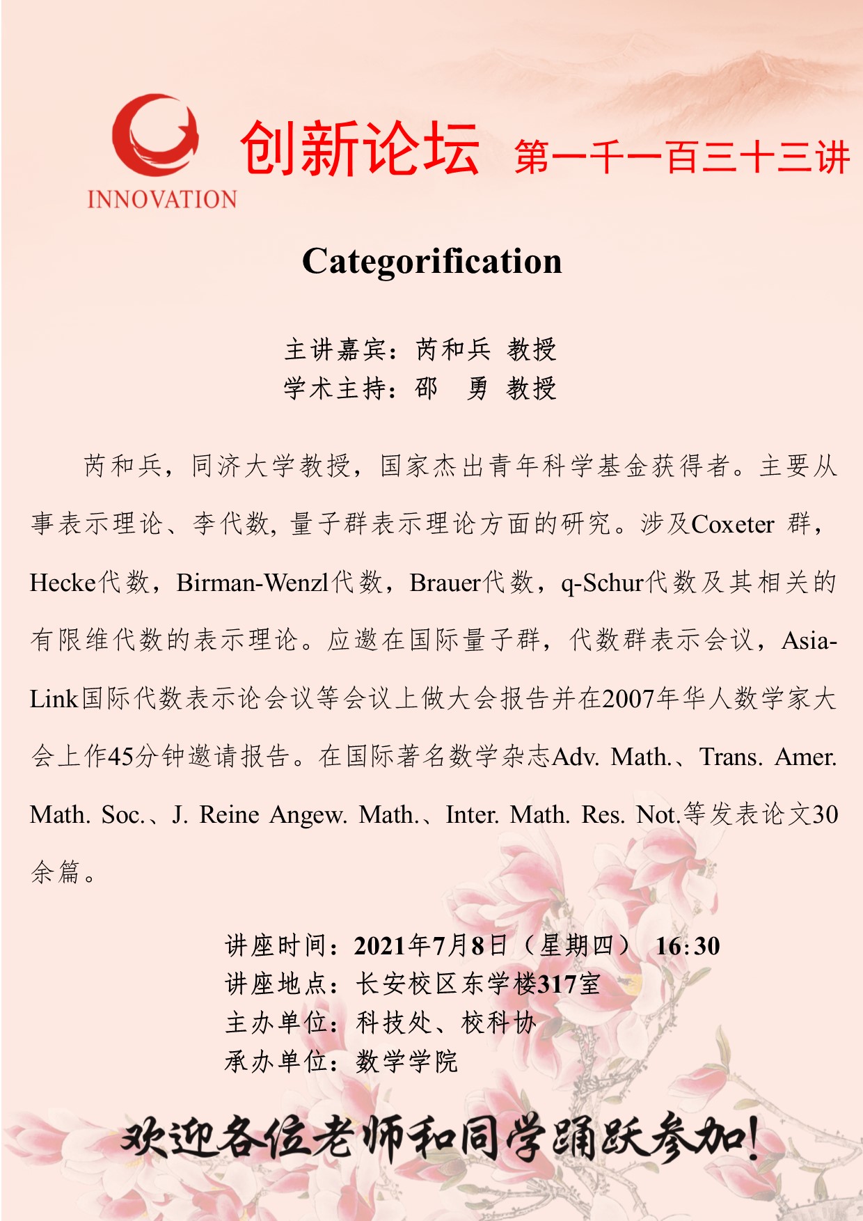 芮和兵 教授 bat365正版唯一官网创新论坛第一千一百三十三讲:Categorification 讲座时间 2021年7月8日(星期四)16:30 讲座地点 长安校区东学楼317室 讲座人介绍 芮和兵 教授 讲座内容