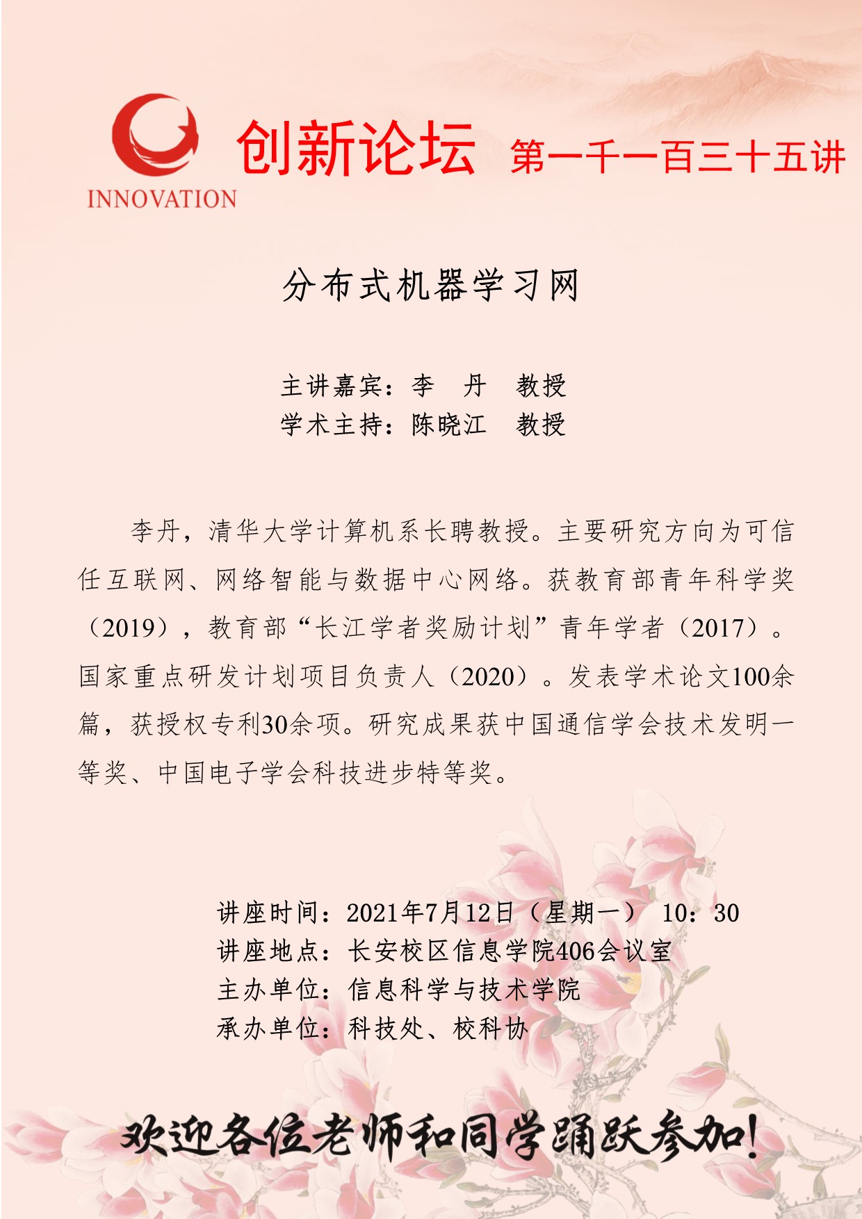 李丹 教授 bat365正版唯一官网创新论坛第一千一百三十五讲:分布式机器学习网 讲座时间 2021年7月12日(星期一)10:30 讲座地点 长安校区信息学院406会议室 讲座人介绍 李丹 教授 讲座内容