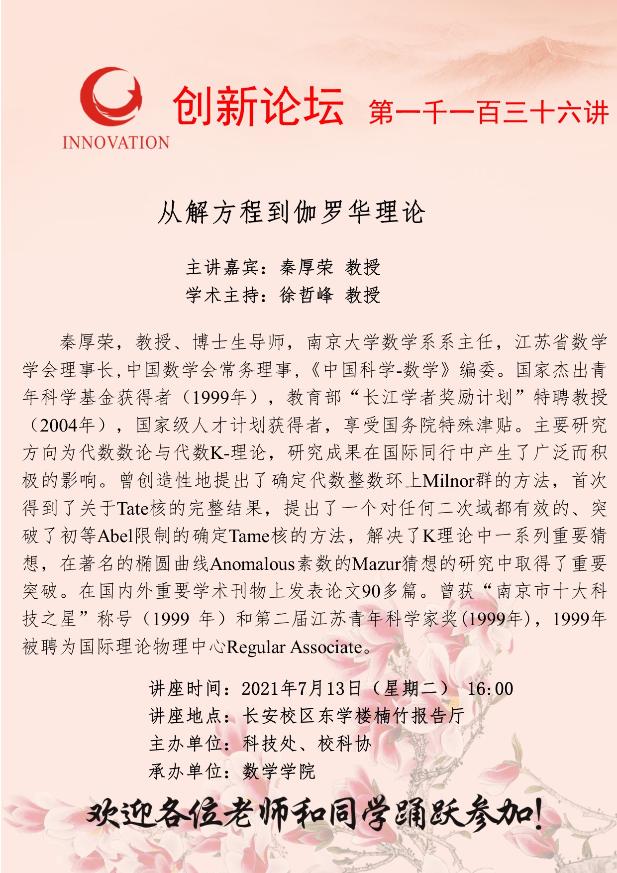 秦厚荣 教授 bat365正版唯一官网创新论坛第一千一百三十六讲:从解方程到伽罗华理论 讲座时间 2021年7月13日 (星期二)16:00 讲座地点 长安校区东学楼楠竹报告厅 讲座人介绍 秦厚荣 教授 讲座内容