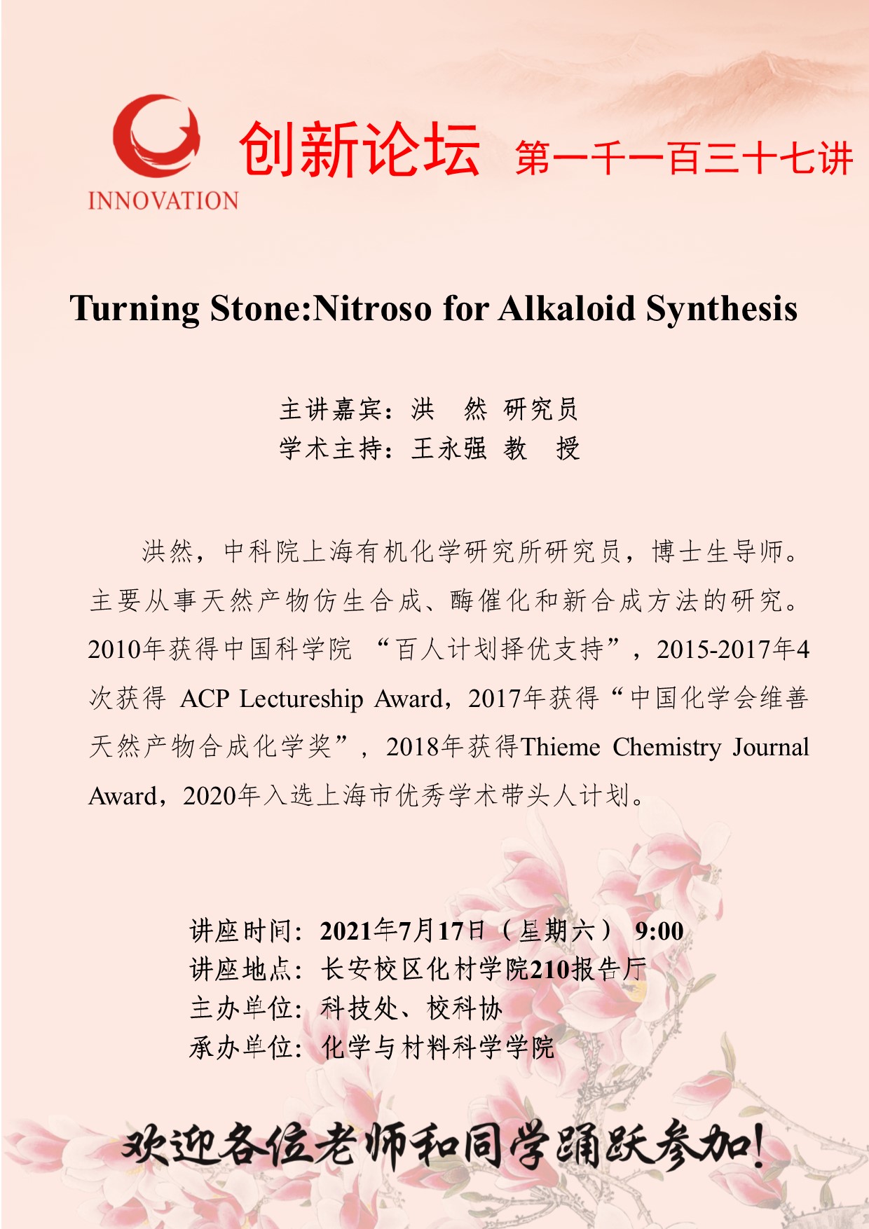 洪然 研究员 bat365正版唯一官网创新论坛第一千一百三十七讲:Turning Stone:Nitroso for Alkaloid Synthesis 讲座时间 2021年7月17日(星期六) 9:00 讲座地点 长安校区化材学院210报告厅 讲座人介绍 洪然 研究员 讲座内容