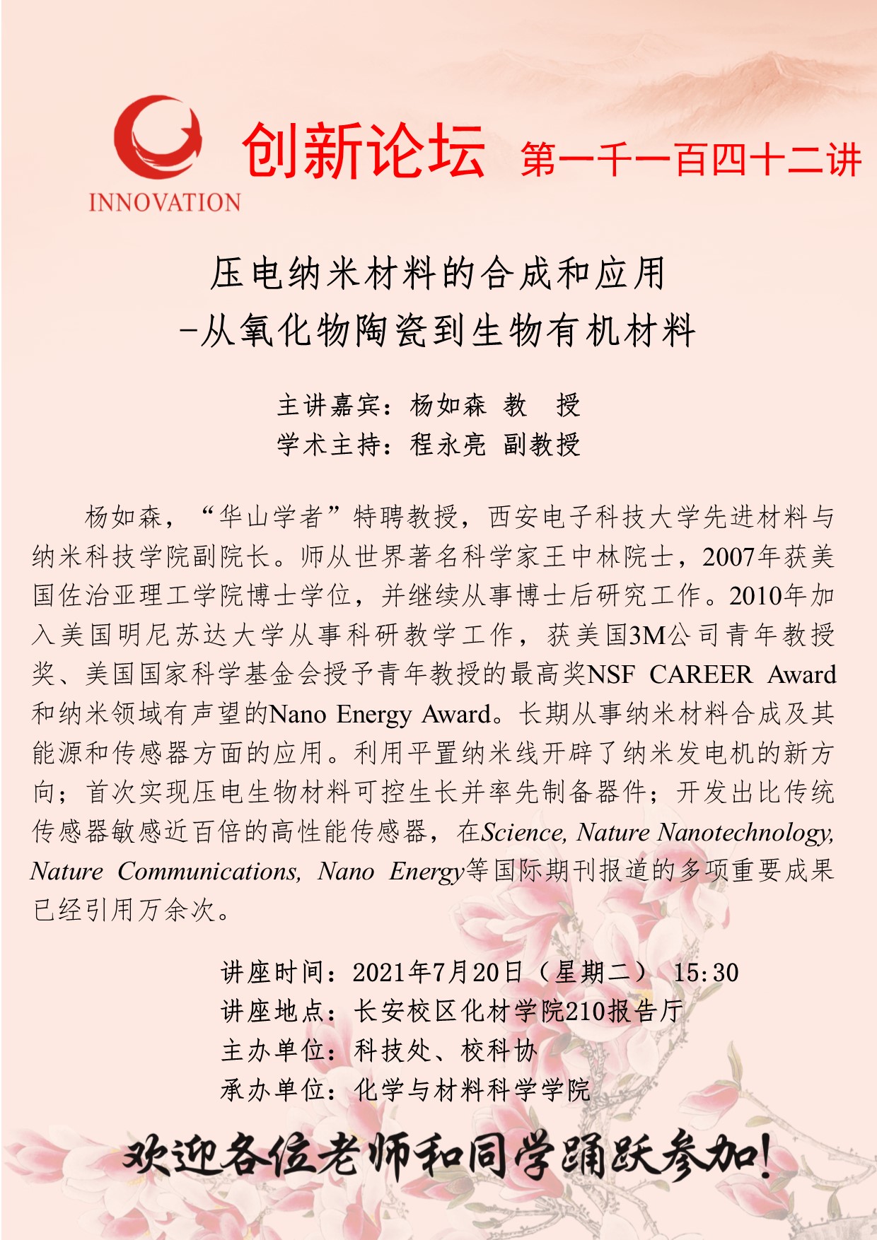 杨如森 教授 bat365正版唯一官网创新论坛第一千一百四十二讲:压电纳米材料的合成和应用-从氧化物陶瓷到生物有机材料 讲座时间 2021年7月20日(星期二) 15:30 讲座地点 长安校区化材学院210报告厅 讲座人介绍 杨如森 教授 讲座内容