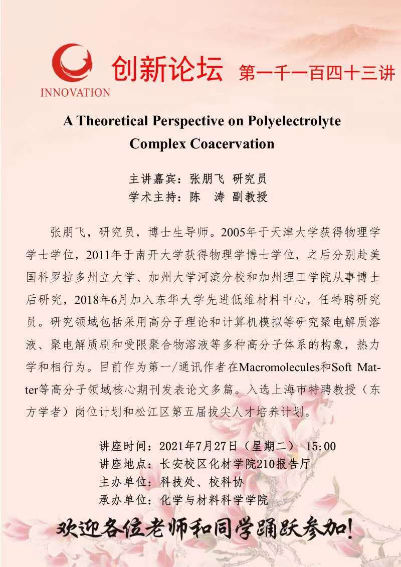 张朋飞 研究员 bat365正版唯一官网创新论坛第一千一百四十三讲:A Theoretical Perspective on Polyelectrolyte Complex Coacervation 讲座时间 2021年7月27日(星期二) 15:00 讲座地点 长安校区化材学院210报告厅 讲座人介绍 张朋飞 研究员 讲座内容