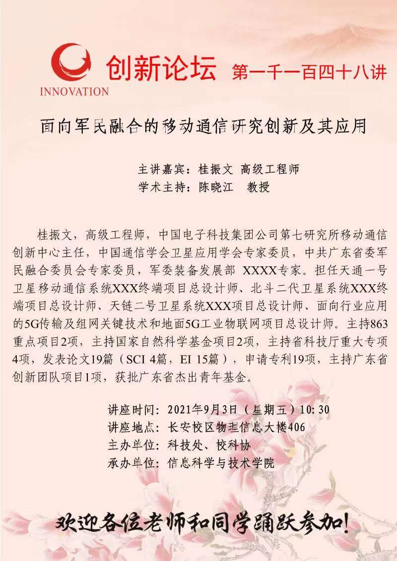 桂振文 高级工程师 bat365正版唯一官网创新论坛第一千一百四十八讲:面向军民融合的移动通信研究创新及其应用 讲座时间 2021年9月3日(星期五)10:30 讲座地点 长安校区物理信息大楼406 讲座人介绍 桂振文 高级工程师 讲座内容