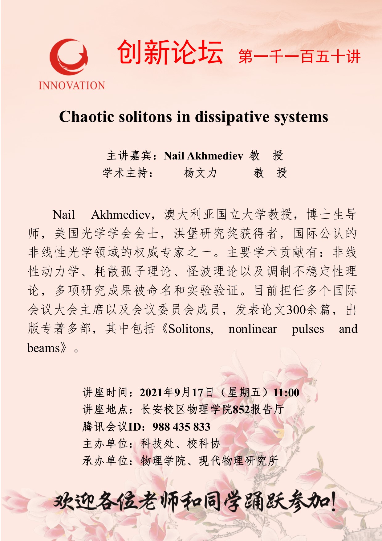 Nail Akhmediev 教授 bat365正版唯一官网创新论坛第一千一百五十讲:Chaotic solitons in dissipative systems 讲座时间 2021年9月17日(星期五)11:00 讲座地点 长安校区物理学院852报告厅 讲座人介绍 Nail Akhmediev 教授 讲座内容