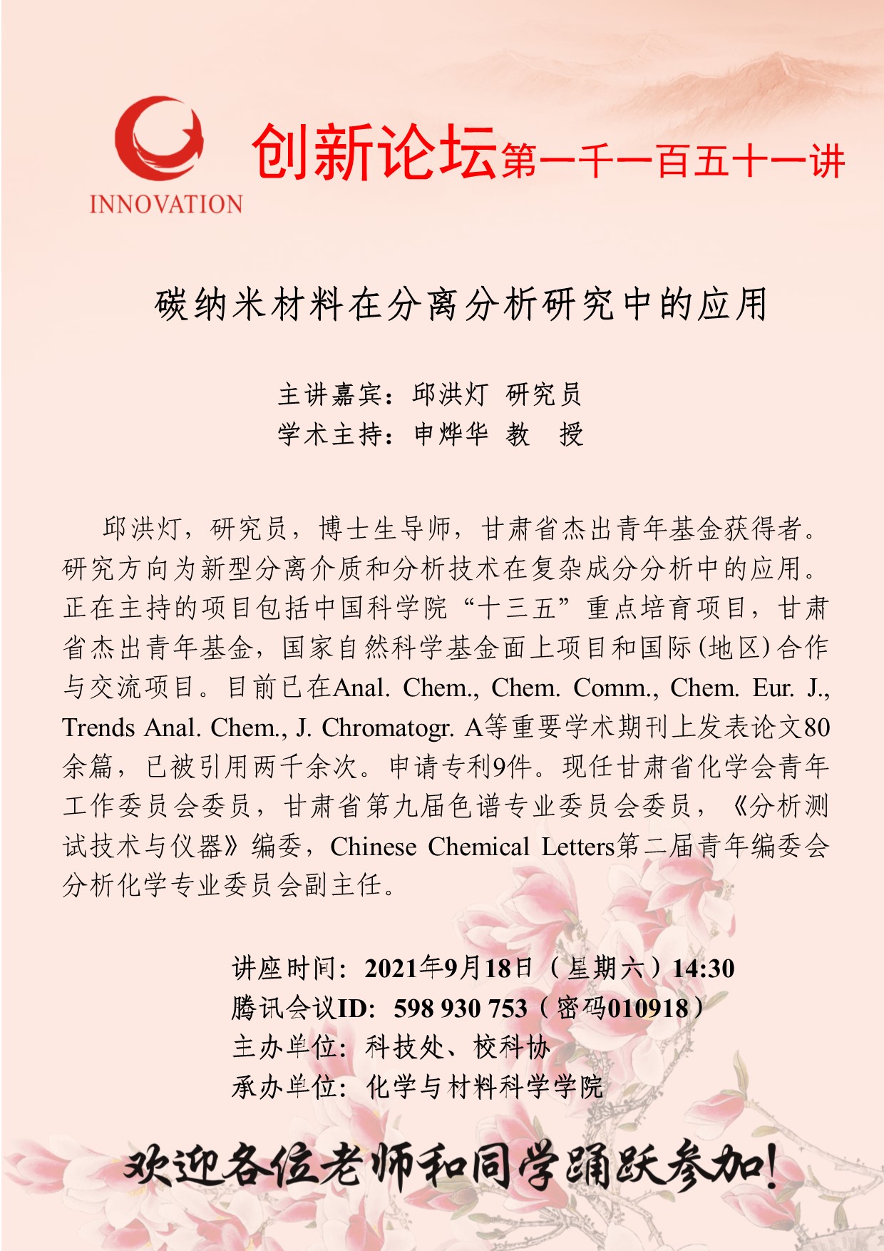 邱洪灯 研究员 bat365正版唯一官网创新论坛第一千一百五十一讲:碳纳米材料在分离分析研究中的应用 讲座时间 2021年9月18日(星期六)14:30 讲座地点 腾讯会议ID:598 930 753 讲座人介绍 邱洪灯 研究员 讲座内容
