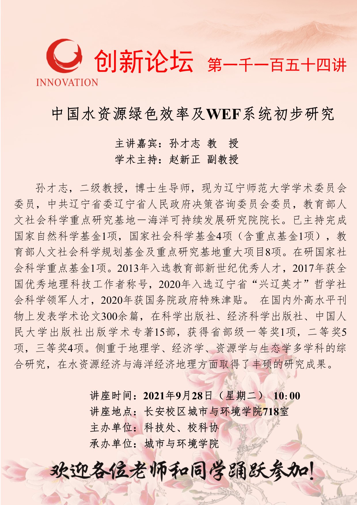 孙才志 教授 bat365正版唯一官网创新论坛第一千一百五十四讲:中国水资源绿色效率及WEF系统初步研究 讲座时间 2021年9月28日(星期二) 10:00 讲座地点 长安校区城市与环境学院718室 讲座人介绍 孙才志 教授 讲座内容