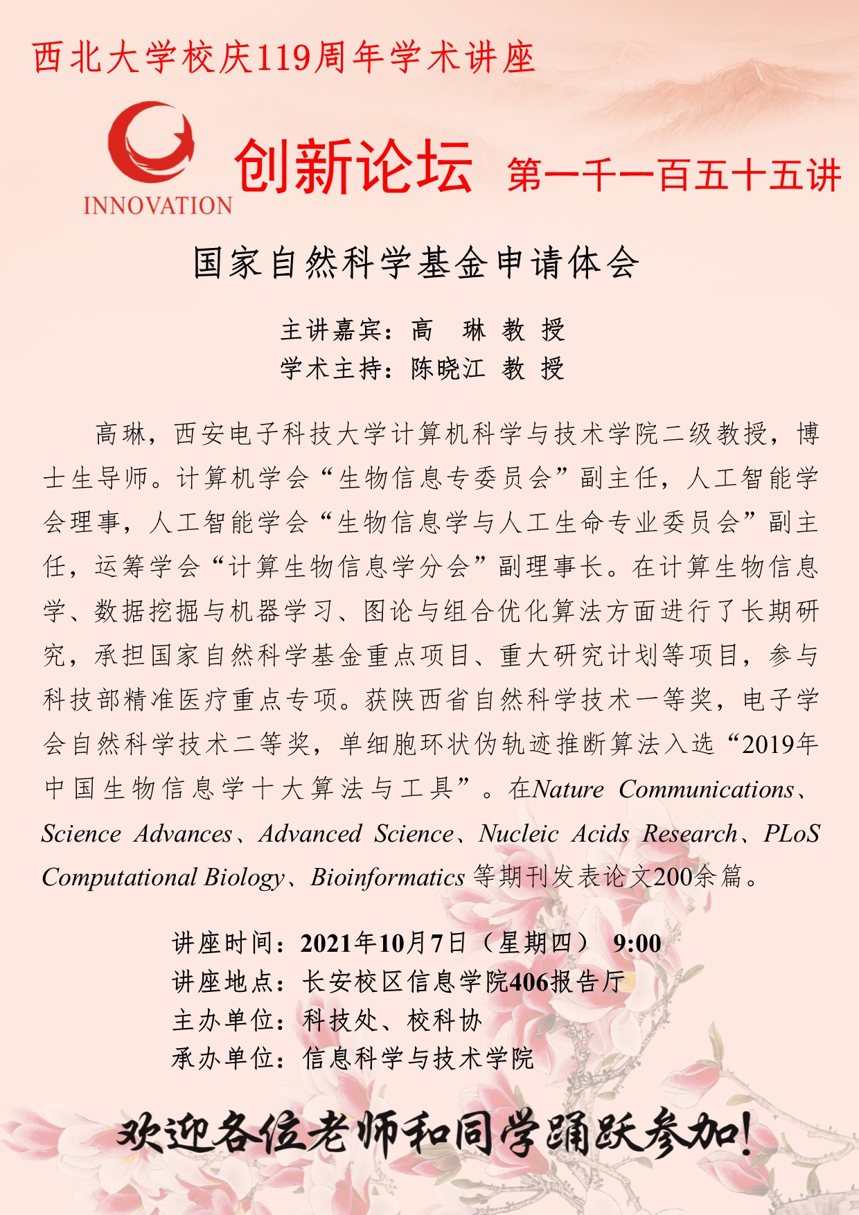 高琳 教授 bat365正版唯一官网创新论坛第一千一百五十五讲暨校庆119周年学术讲座: 国家自然科学基金申请体会 讲座时间 2021年10月7日(星期四) 9:00 讲座地点 长安校区信息学院406报告厅 讲座人介绍 高琳 教授 讲座内容
