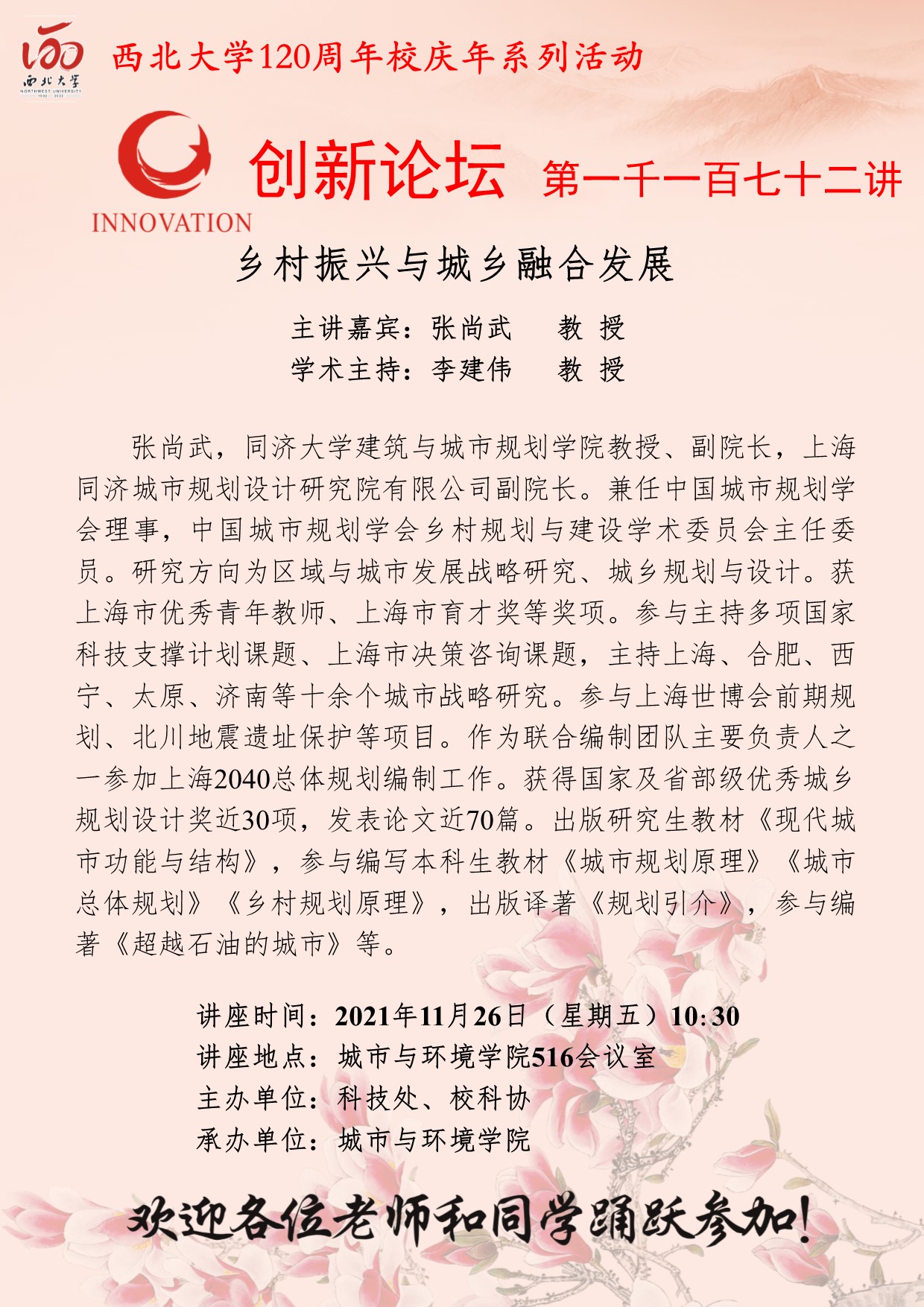 张尚武 教授 bat365正版唯一官网创新论坛第一千一百七十二讲暨120周年校庆年系列活动:乡村振兴与城乡融合发展 讲座时间 2021年11月26日(星期五)10:30 讲座地点 城市与环境学院516会议室 讲座人介绍 张尚武 教授 讲座内容