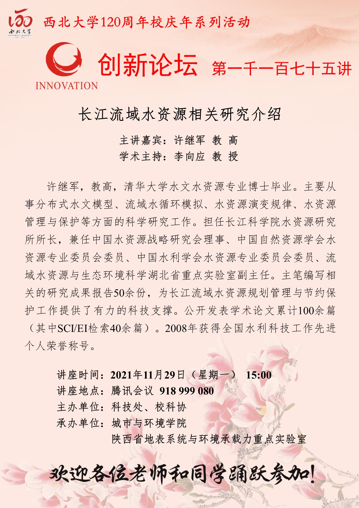 许继军 教高 bat365正版唯一官网创新论坛第一千一百七十五讲暨120周年校庆年系列活动:长江流域水资源相关研究介绍 讲座时间 2021年11月29日(星期一) 15:00 讲座地点 腾讯会议:918999080 讲座人介绍 许继军 教高 讲座内容
