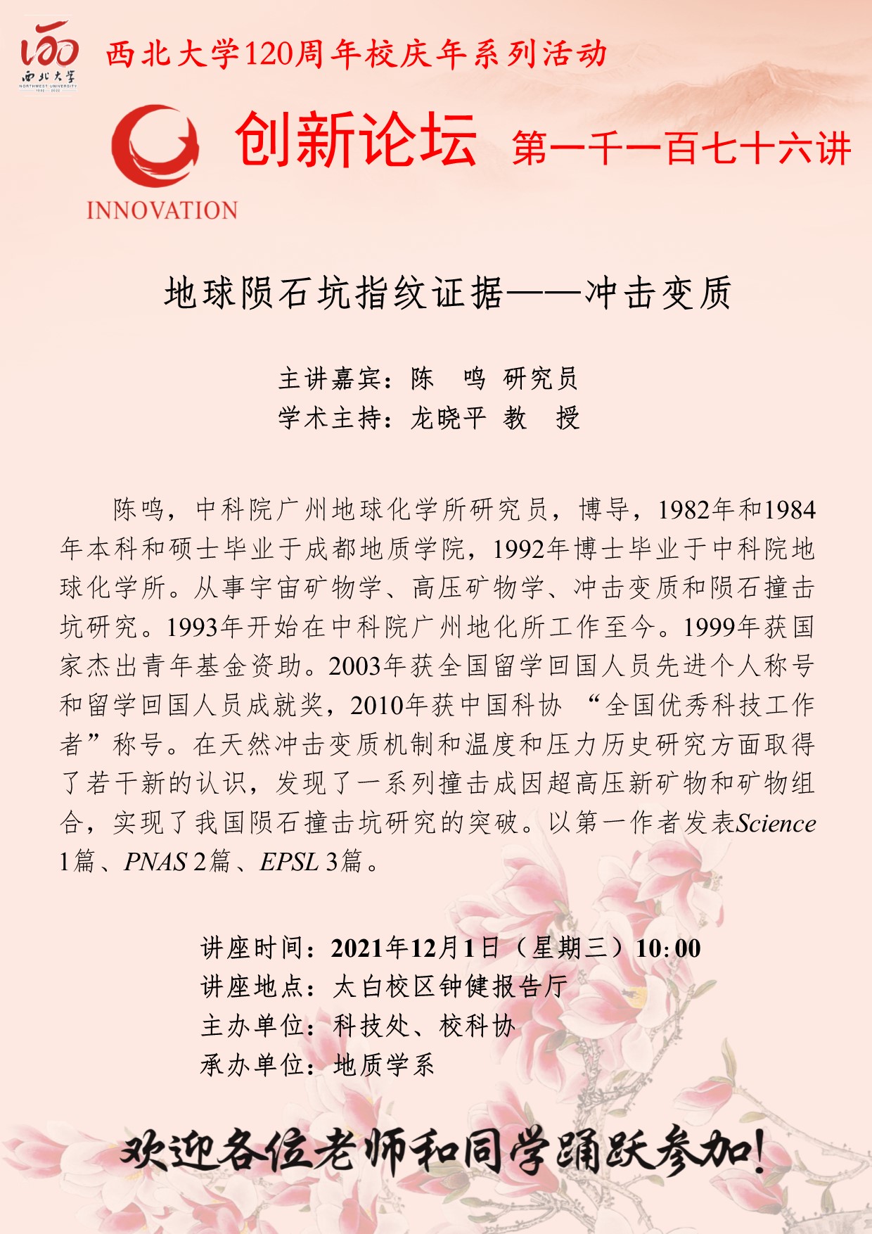 陈鸣 研究员 bat365正版唯一官网创新论坛第一千一百七十六讲暨120周年校庆年系列活动:地球陨石坑指纹证据——冲击变质 讲座时间 2021年12月1日(星期三)10:00 讲座地点 太白校区钟健报告厅 讲座人介绍 陈鸣 研究员 讲座内容
