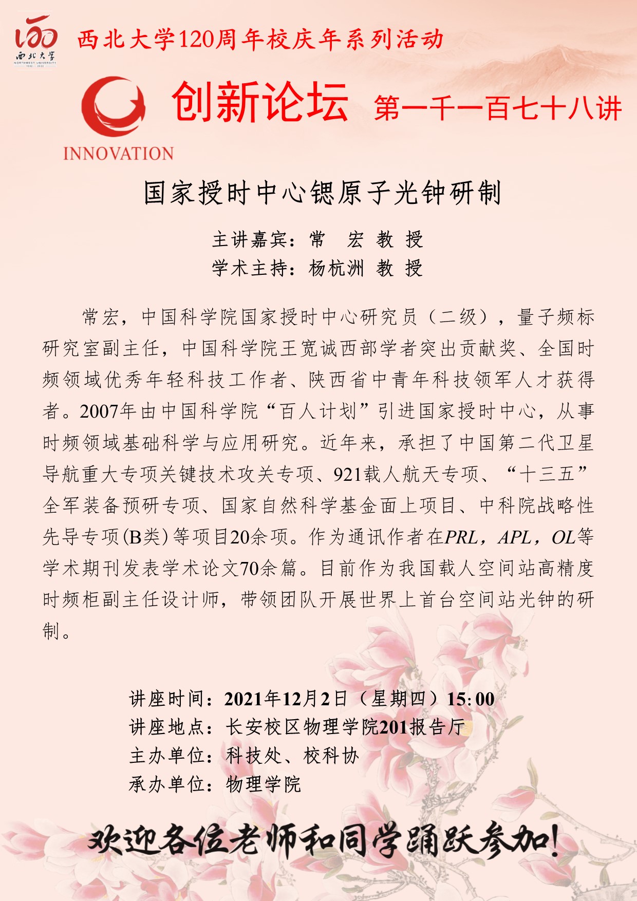 常宏 教授 bat365正版唯一官网创新论坛第一千一百七十八讲暨120周年校庆年系列活动:国家授时中心锶原子光钟研制 讲座时间 2021年12月2日(星期四)15:00 讲座地点 长安校区物理学院201报告厅 讲座人介绍 常宏 教授 讲座内容