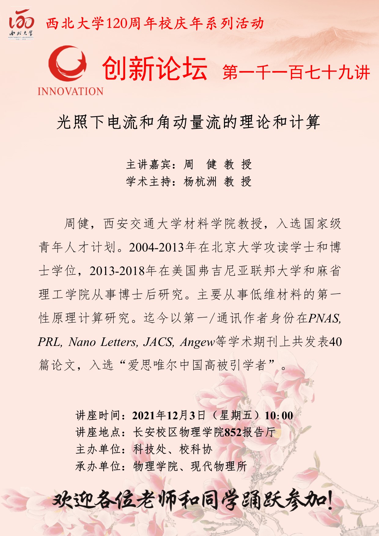 周健 教授 bat365正版唯一官网创新论坛第一千一百七十九讲暨120周年校庆年系列活动:光照下电流和角动量流的理论和计算 讲座时间 2021年12月3日(星期五)10:00 讲座地点 长安校区物理学院852报告厅 讲座人介绍 周健 教授 讲座内容
