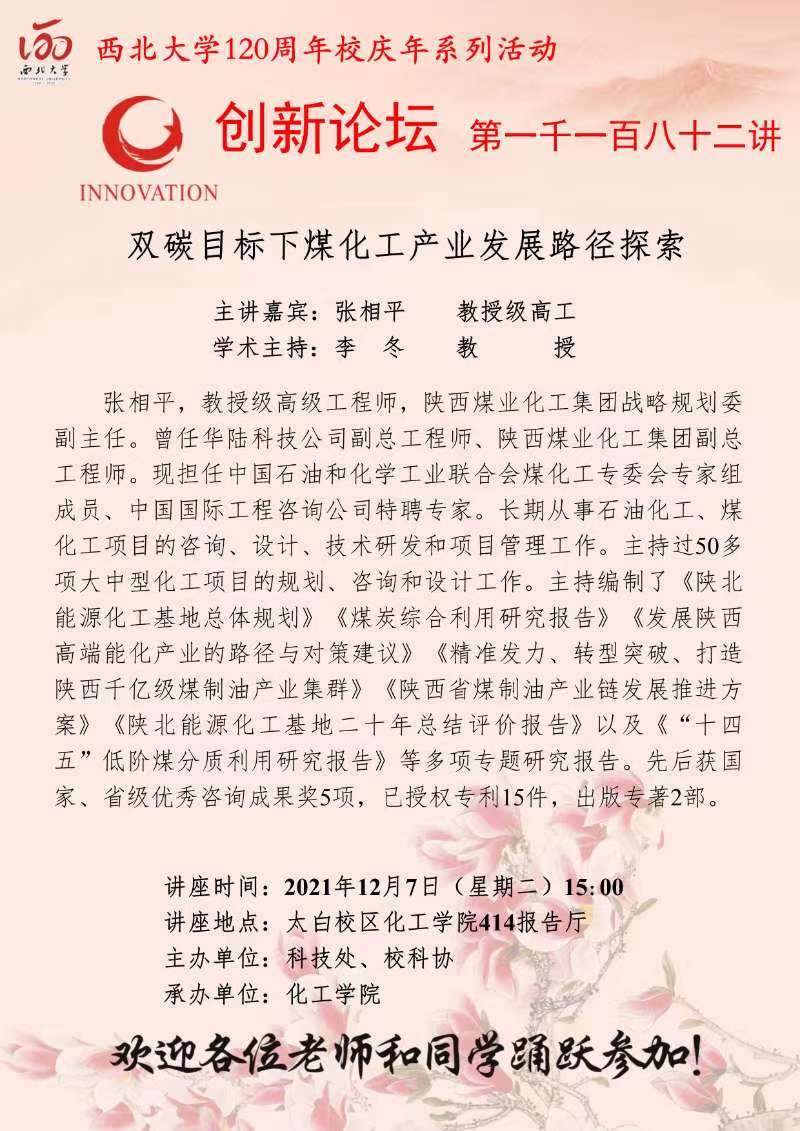 张相平 教授级高工 bat365正版唯一官网创新论坛第一千一百八十二讲暨120周年校庆年系列活动:双碳目标下煤化工产业发展路径探索 讲座时间 2021年12月7日(星期二)15:00 讲座地点 太白校区化工学院414报告厅 讲座人介绍 张相平 教授级高工 讲座内容