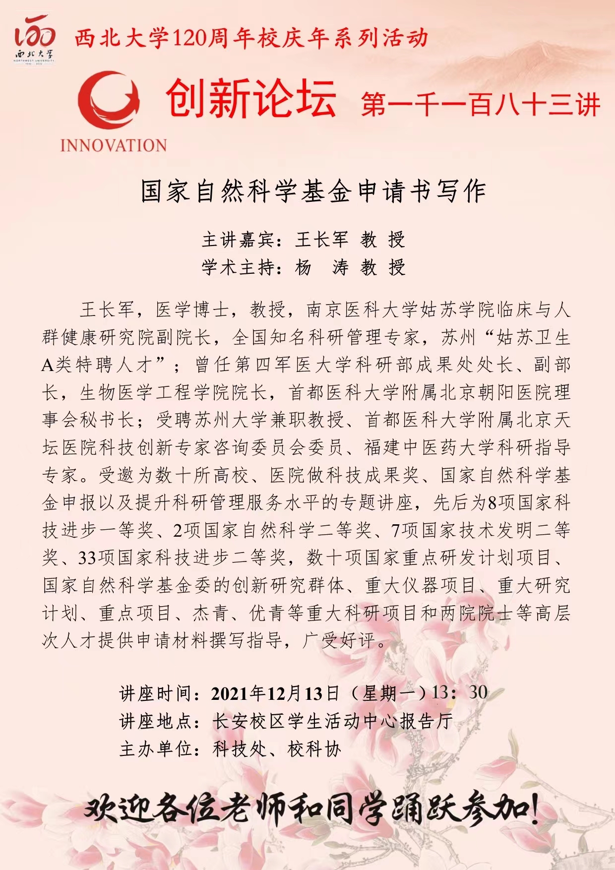 王长军 教授 bat365正版唯一官网创新论坛第一千一百八十三讲暨120周年校庆年系列活动:国家自然科学基金申请书写作 讲座时间 2021年12月13日(星期一)13:30 讲座地点 长安校区学生活动中心报告厅 讲座人介绍 王长军 教授 讲座内容