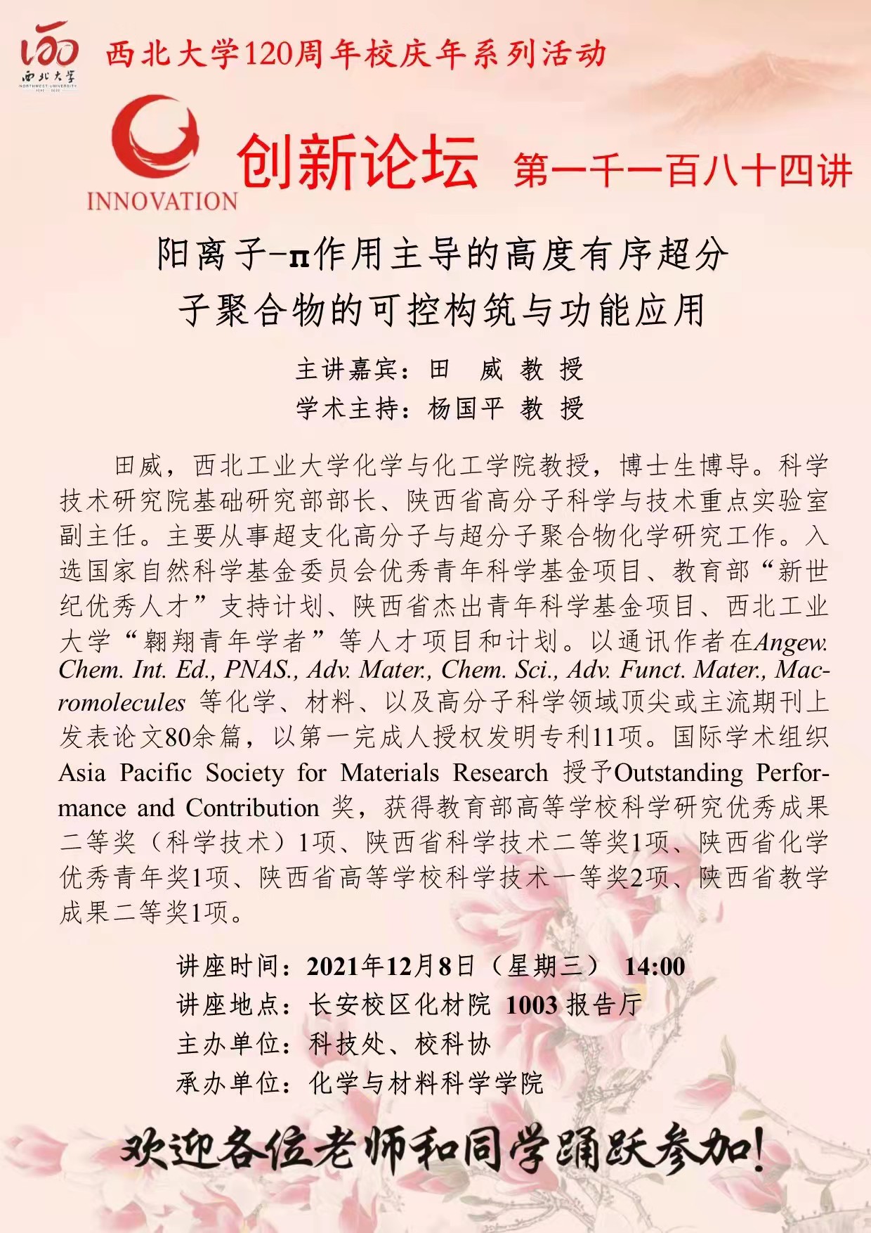 田威 教授 bat365正版唯一官网创新论坛第一千一百八十四讲暨120周年校庆年系列活动:阳离子-π作用主导的高度有序超分子聚合物的可控构筑与功能应用 讲座时间 2021年12月8日(星期三) 14:00 讲座地点 长安校区化材院 1003 报告厅 讲座人介绍 田威 教授 讲座内容