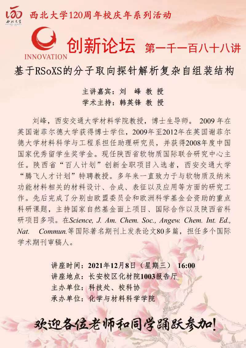 刘峰 教授 bat365正版唯一官网创新论坛第一千一百八十八讲暨120周年校庆年系列活动:基于RSoXS的分子取向探针解析复杂自组装结构 讲座时间 2021年12月8日(星期三) 16:00 讲座地点 长安校区化材院1003报告厅 讲座人介绍 刘峰 教授 讲座内容