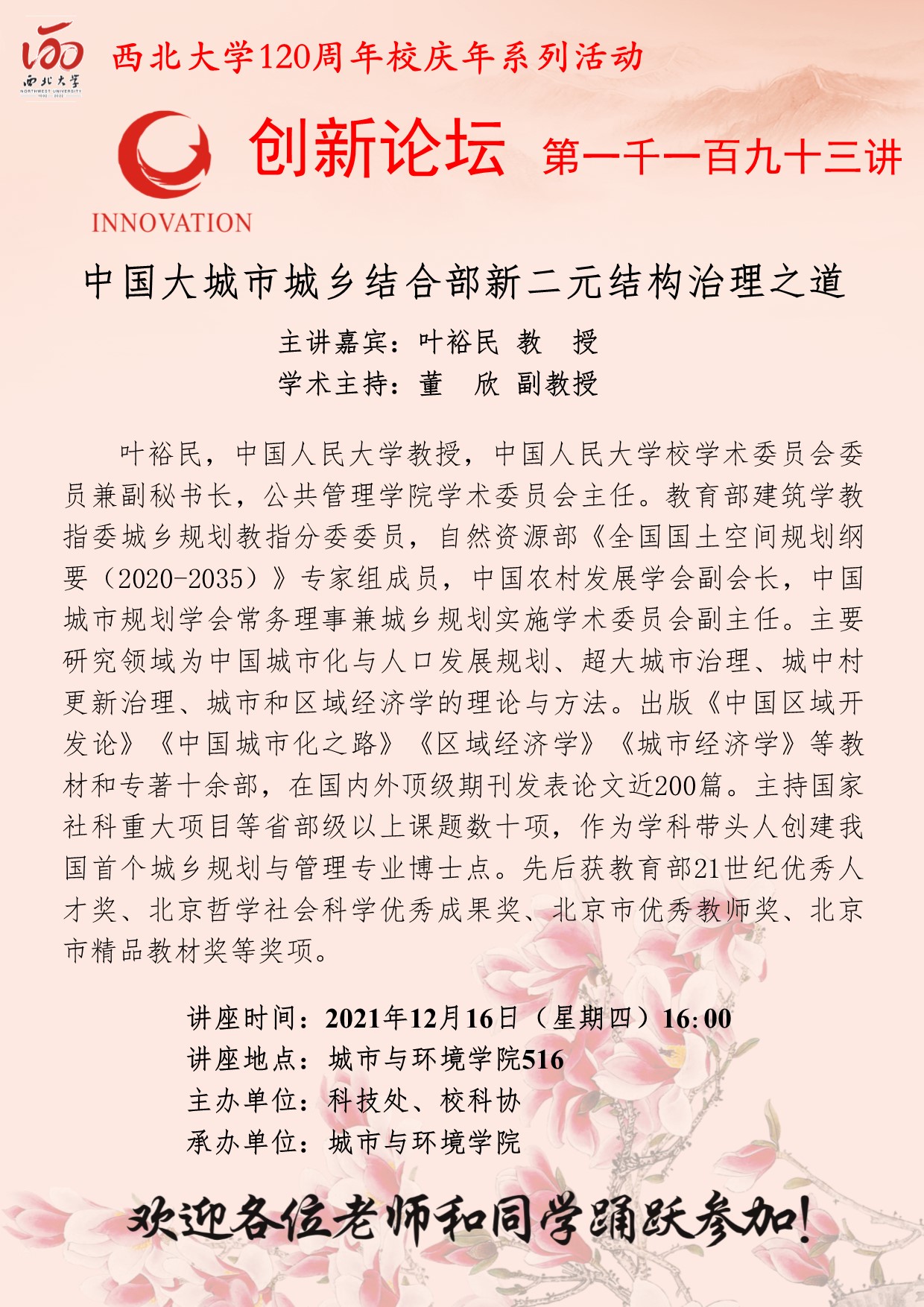 叶裕民 教授 bat365正版唯一官网创新论坛第一千一百九十三讲暨120周年校庆年系列活动:中国大城市城乡结合部新二元结构治理之道 讲座时间 2021年12月16日(星期四)16:00 讲座地点 城市与环境学院516 讲座人介绍 叶裕民 教授 讲座内容
