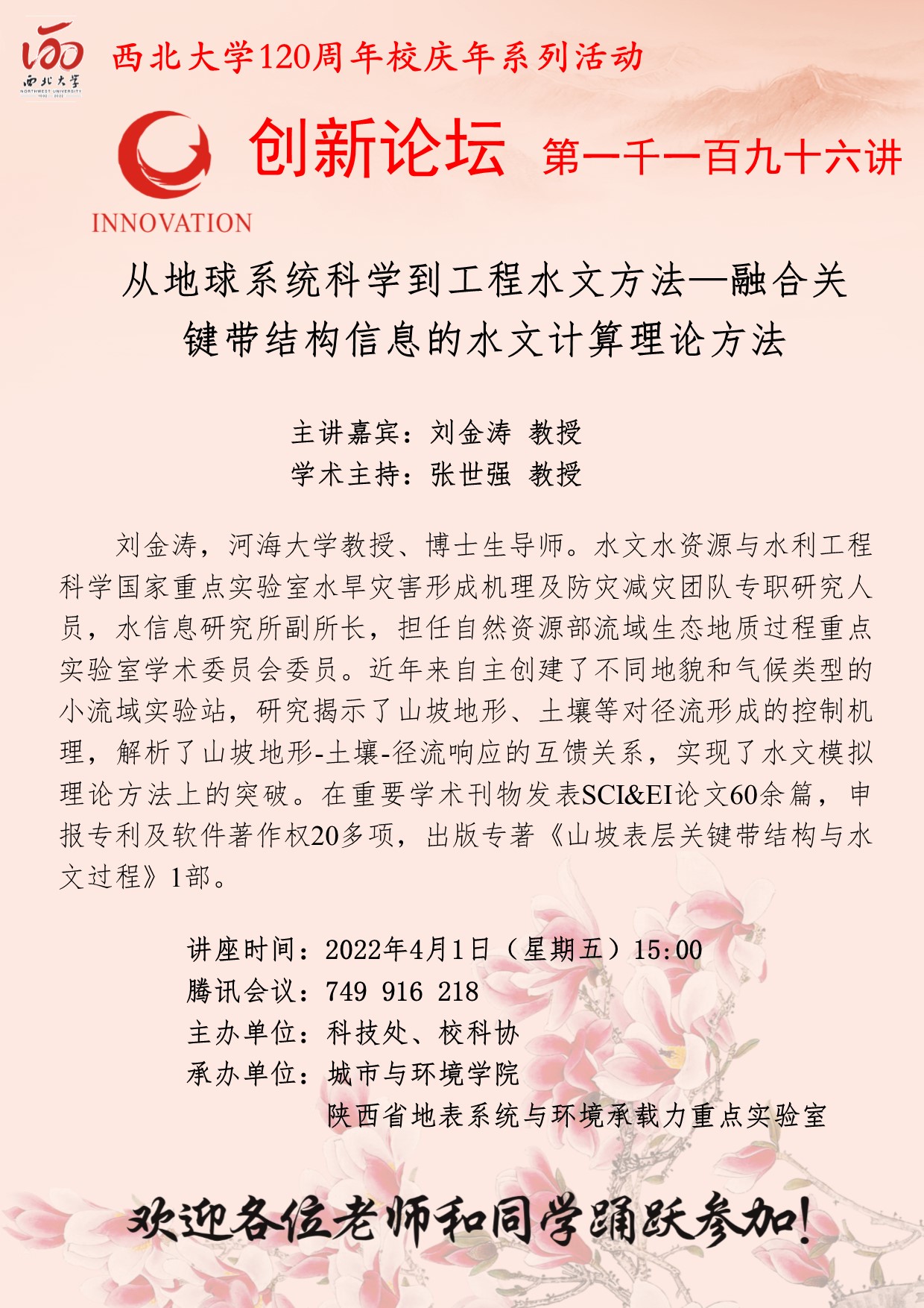 刘金涛 教授 bat365正版唯一官网创新论坛第一千一百九十六讲暨120周年校庆年系列活动:从地球系统科学到工程水文方法—融合关键带结构信息的水文计算理论方法 讲座时间 2022年4月1日(星期五)15:00 讲座地点 腾讯会议:749 916 218 讲座人介绍 刘金涛 教授 讲座内容