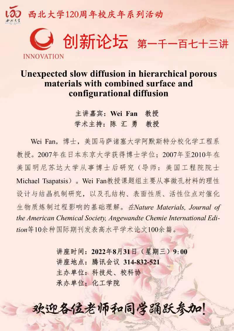 Wei Fan 教授 bat365正版唯一官网创新论坛第一千二百七十三讲暨120周年校庆年系列活动: Unexpected slow diffusion in hierarchical porous materials with combined surface and configurational diffusion 讲座时间 2022年8月31日(星期三)9:00 讲座地点 腾讯会议 314-832-521 讲座人介绍 Wei Fan 教授 讲座内容