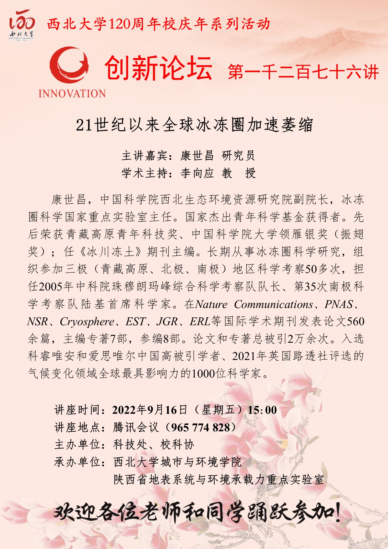 康世昌 研究员 bat365正版唯一官网创新论坛第一千二百七十六讲暨120周年校庆年系列活动:21世纪以来全球冰冻圈加速萎缩 讲座时间 2022年9月16日(星期五)15:00 讲座地点 腾讯会议(965 774 828) 讲座人介绍 康世昌 研究员 讲座内容