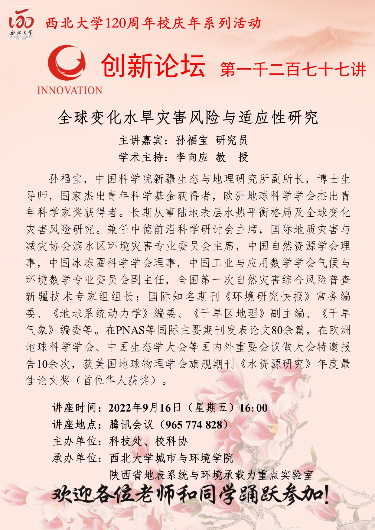 孙福宝 研究员 bat365正版唯一官网创新论坛第一千二百七十七讲暨120周年校庆年系列活动:全球变化水旱灾害风险与适应性研究 讲座时间 2022年9月16日(星期五)16:00 讲座地点 腾讯会议(965 774 828) 讲座人介绍 孙福宝 研究员 讲座内容