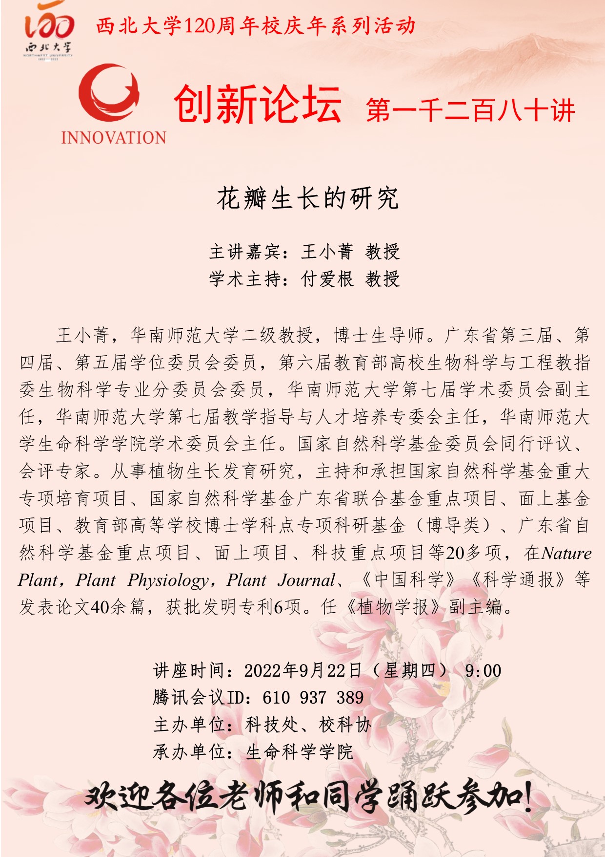 王小菁 教授 bat365正版唯一官网创新论坛第一千二百八十讲暨120周年校庆年系列活动:花瓣生长的研究 讲座时间 2022年9月22日(星期四) 9:00 讲座地点 腾讯会议ID:610 937 389 讲座人介绍 王小菁 教授 讲座内容