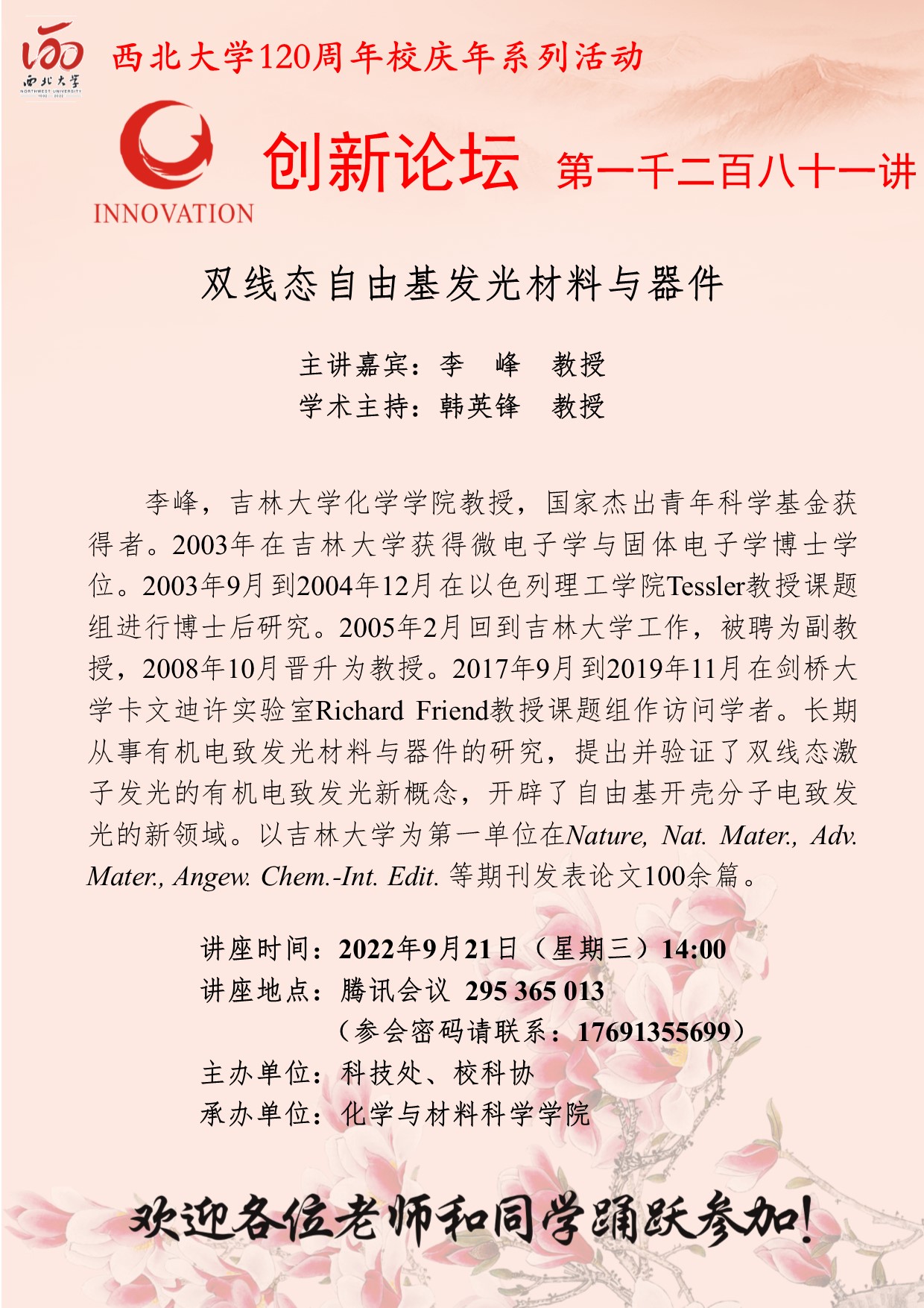 李峰 教授 bat365正版唯一官网创新论坛第一千二百八十一讲暨120周年校庆年系列活动: 双线态自由基发光材料与器件 讲座时间 2022年9月21日(星期三) 14:00 讲座地点 腾讯会议ID:295 365 013 (参会密码请联系:17691355699) 讲座人介绍 李峰 教授 讲座内容
