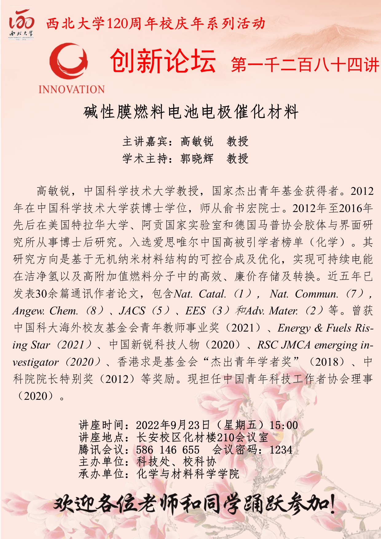 高敏锐 教授 bat365正版唯一官网创新论坛第一千二百八十四讲暨120周年校庆年系列活动:碱性膜燃料电池电极催化材料 讲座时间 2022年9月21日(星期五) 15:00 讲座地点 长安校区化材楼210会议室 (腾讯会议:586 146 655 会议密码:1234) 讲座人介绍 高敏锐 教授 讲座内容