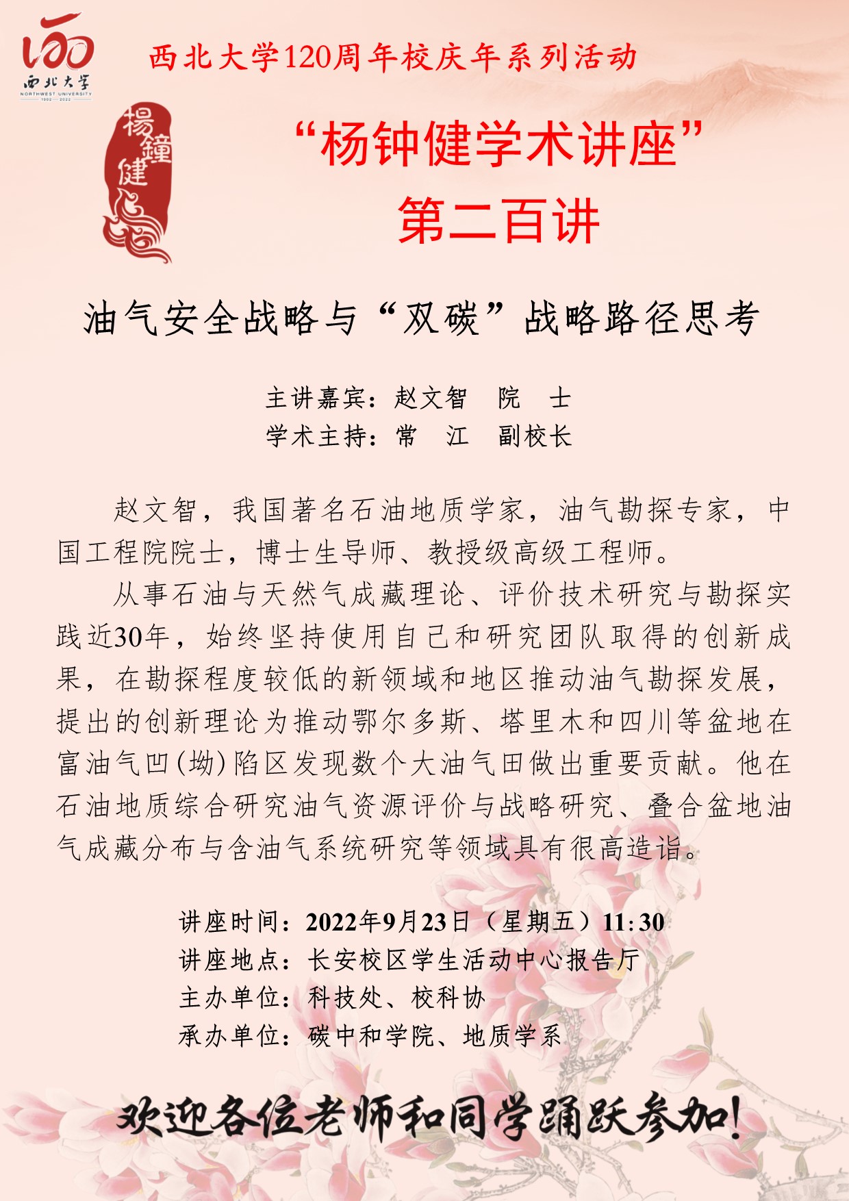 赵文智 院士 “杨钟健学术讲座”第二百讲暨120周年校庆年系列活动:油气安全战略与“双碳”战略路径思考 讲座时间 2022年9月23日(星期五)11:30 讲座地点 长安校区学生活动中心报告厅 讲座人介绍 赵文智 院士 讲座内容