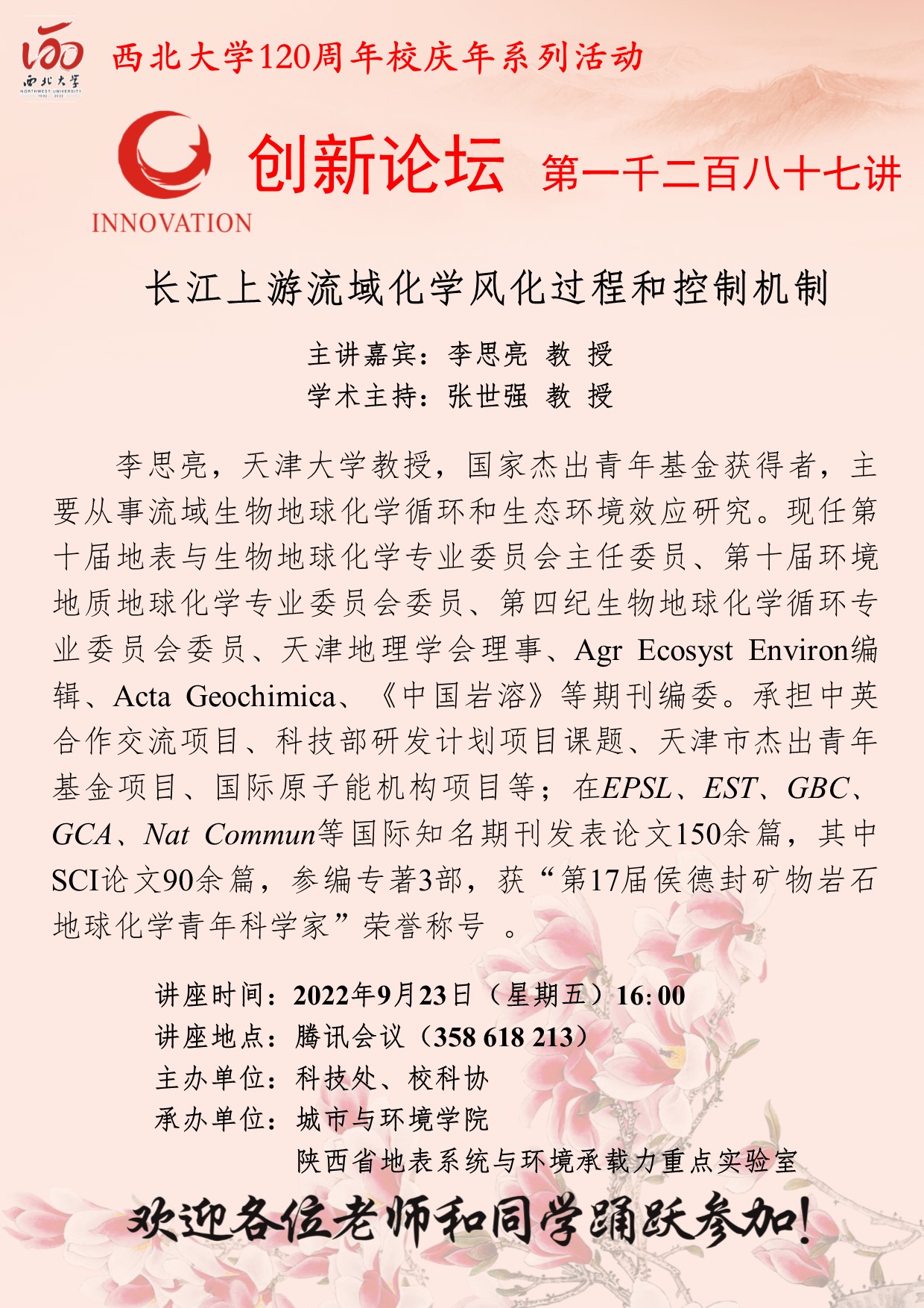 李思亮 教授 bat365正版唯一官网创新论坛第一千二百八十七讲暨120周年校庆年系列活动: 长江上游流域化学风化过程和控制机制 讲座时间 2022年9月23日(星期五)16:00 讲座地点 腾讯会议(358 618 213) 讲座人介绍 李思亮 教授 讲座内容