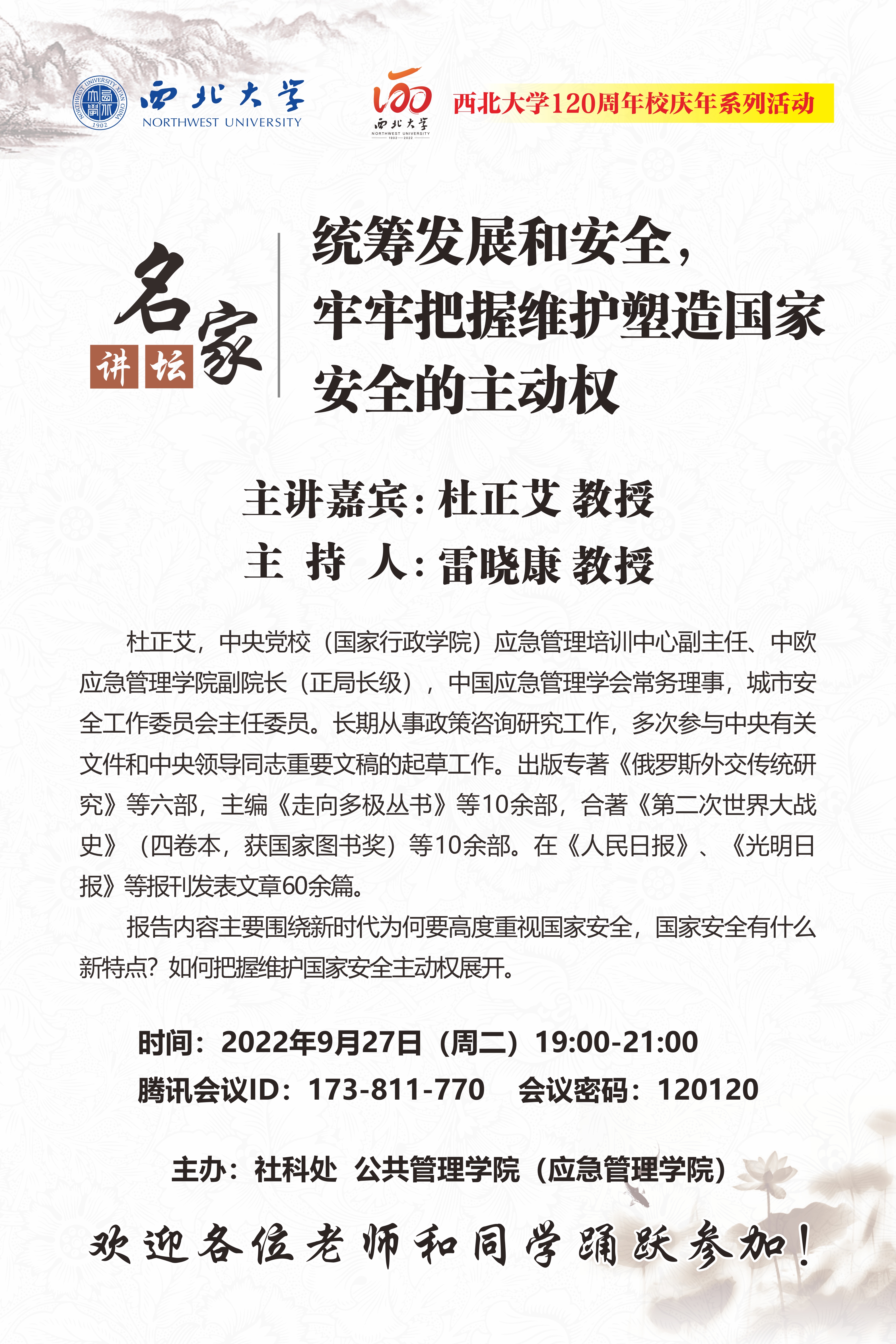 杜正艾 教授 名家讲坛暨120周年校庆年系列活动:统筹发展和安全,牢牢把握维护塑造国家安全的主动权 讲座时间 2022年9月27日(周二) 19:00-21:00 讲座地点 腾讯会议ID:173-811-770 讲座人介绍 杜正艾 教授 讲座内容