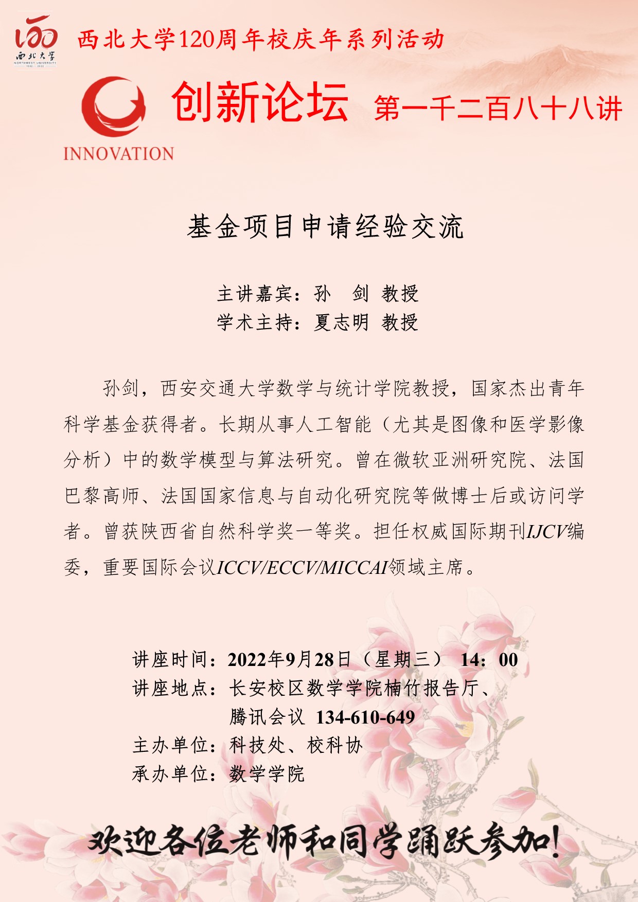 孙 剑 教授 bat365正版唯一官网创新论坛第一千二百八十八讲暨120周年校庆年系列活动:基金项目申请经验交流 讲座时间 2022年9月28日(星期三) 14:00 讲座地点 长安校区数学学院楠竹报告厅、腾讯会议 134-610-649 讲座人介绍 孙 剑 教授 讲座内容