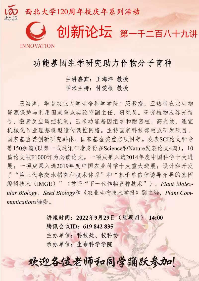 王海洋 教授 bat365正版唯一官网创新论坛第一千二百八十九讲暨120周年校庆年系列活动: 功能基因组学研究助力作物分子育种 讲座时间 2022年9月29日(星期四) 14:00 讲座地点 腾讯会议 619 842 835 讲座人介绍 王海洋 教授 讲座内容