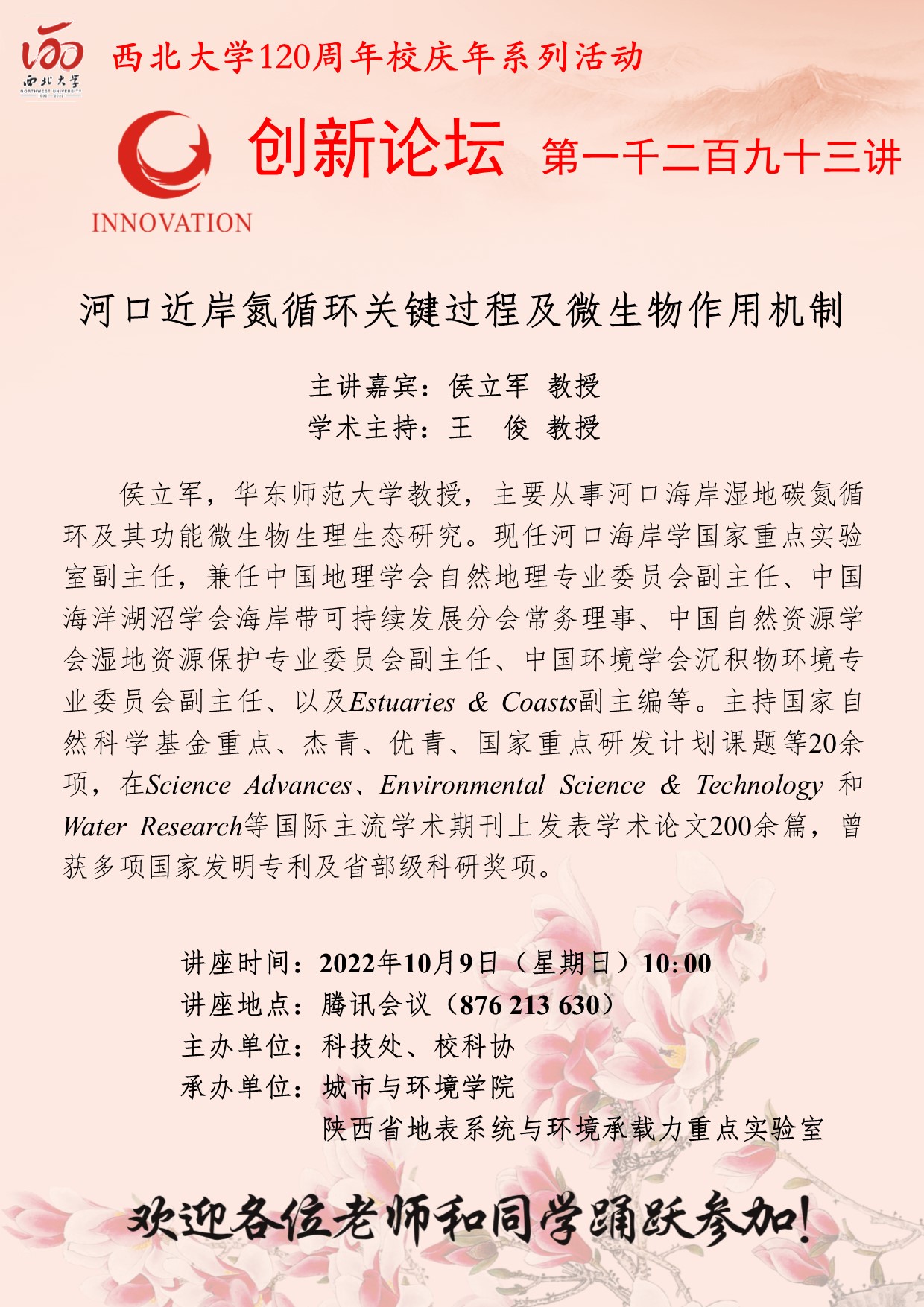 侯立军 教授 bat365正版唯一官网创新论坛第一千二百九十三讲暨120周年校庆年系列活动: 河口近岸氮循环关键过程及微生物作用机制 讲座时间 2022年10月9日(星期日)10:00 讲座地点 腾讯会议(876 213 630) 讲座人介绍 侯立军 教授 讲座内容