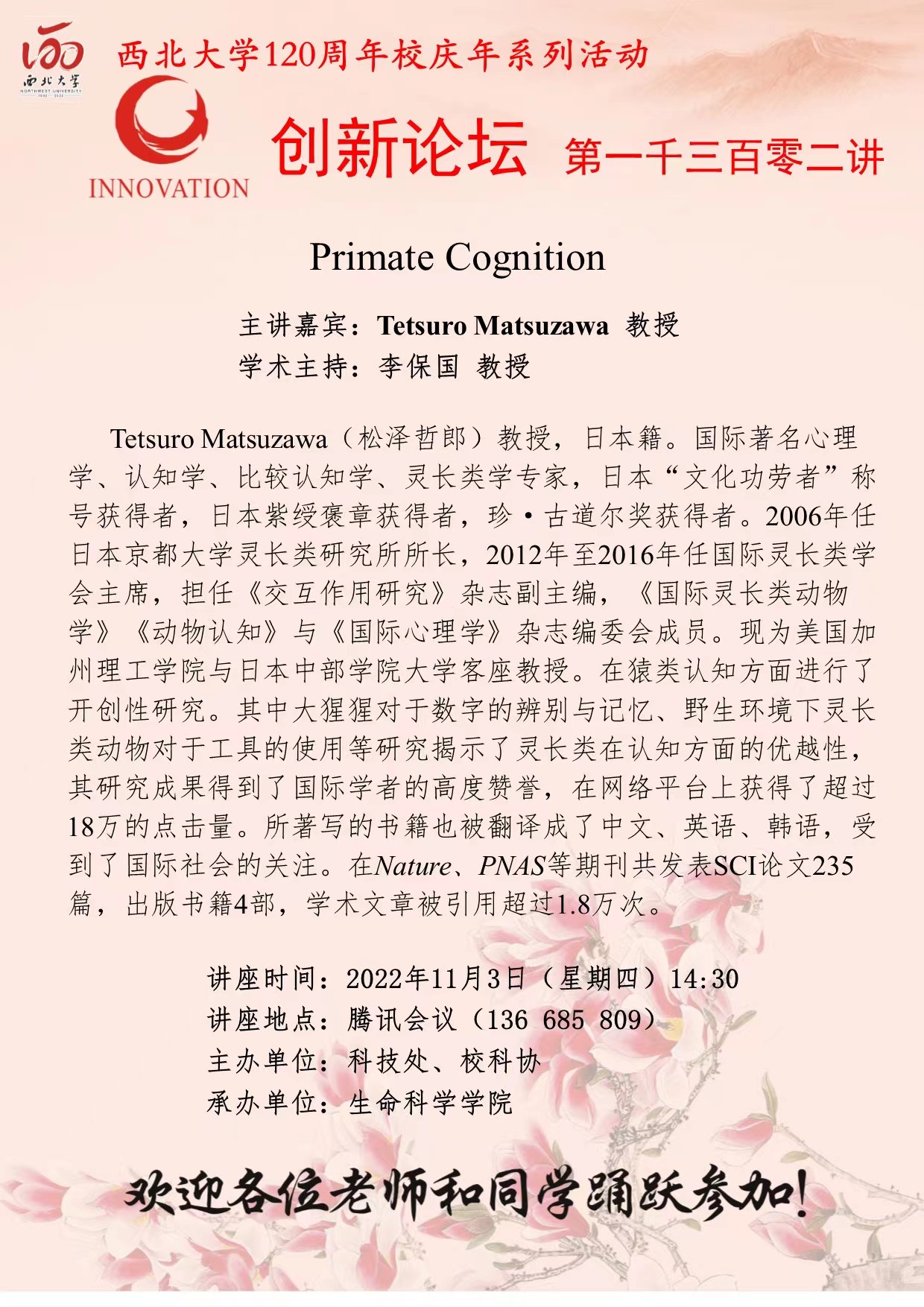 Tetsuro Matsuzawa 教授 bat365正版唯一官网创新论坛第一千三百零二讲暨120周年校庆年系列活动: Primate Cognition 讲座时间 2022年11月3日(星期四)14:30 讲座地点 腾讯会议 136 685 809 讲座人介绍 Tetsuro Matsuzawa 教授 讲座内容