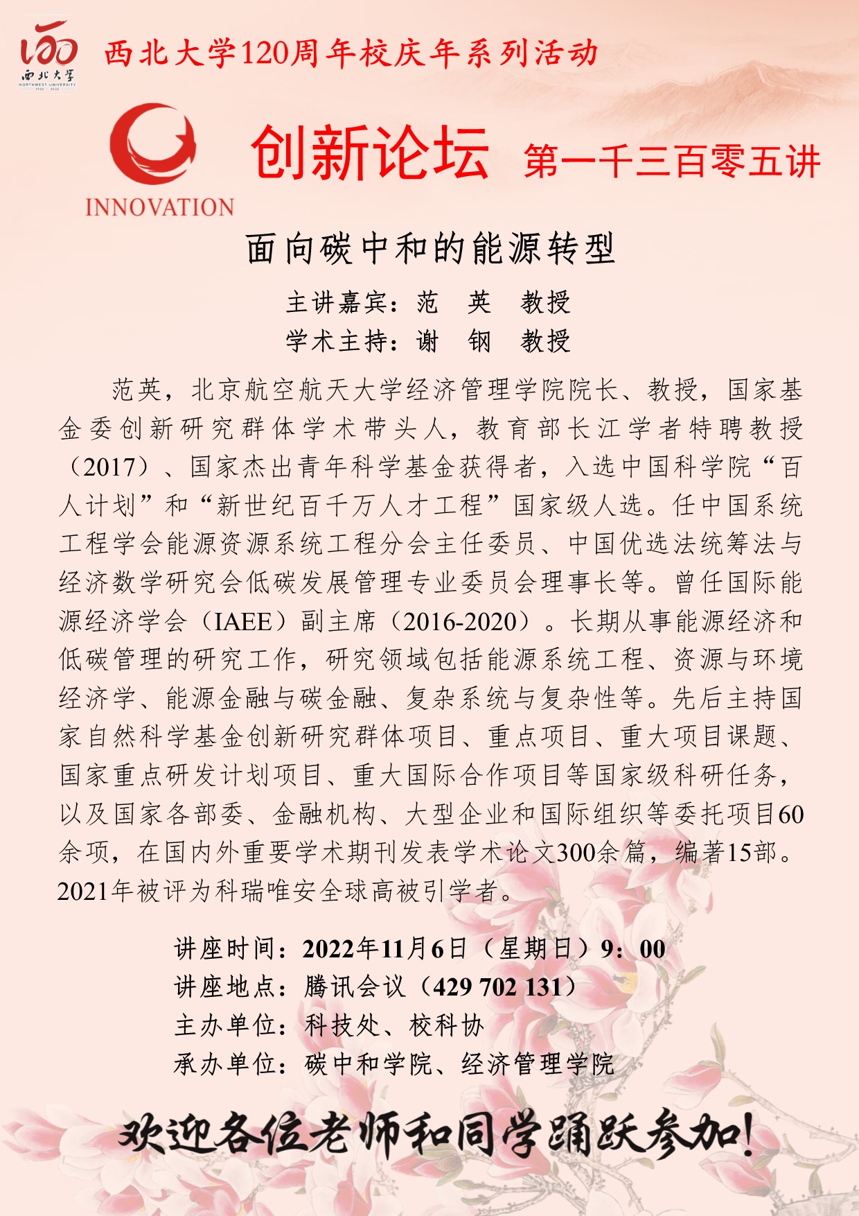 范英 教授 bat365正版唯一官网创新论坛第一千三百零五讲暨120周年校庆年系列活动: 面向碳中和的能源转型 讲座时间 2022年11月6日(星期日)9:00 讲座地点 腾讯会议(429 702 131) 讲座人介绍 范英 教授 讲座内容
