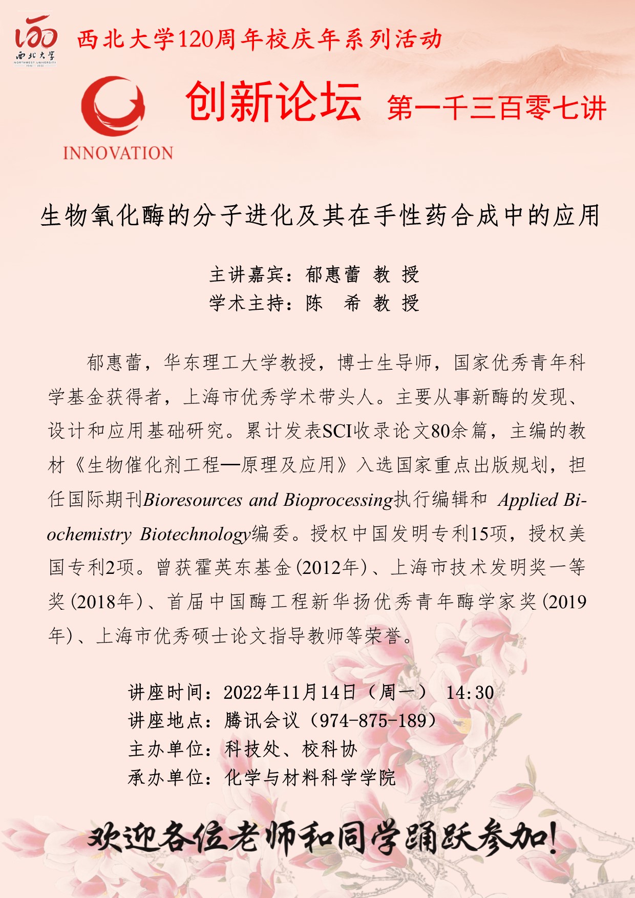 郁惠蕾 教授 bat365正版唯一官网创新论坛第一千三百零七讲暨120周年校庆年系列活动: 生物氧化酶的分子进化及其在手性药合成中的应用 讲座时间 2022年11月14日(星期一)14:30 讲座地点 腾讯会议(974 875 189) 讲座人介绍 郁惠蕾 教授 讲座内容