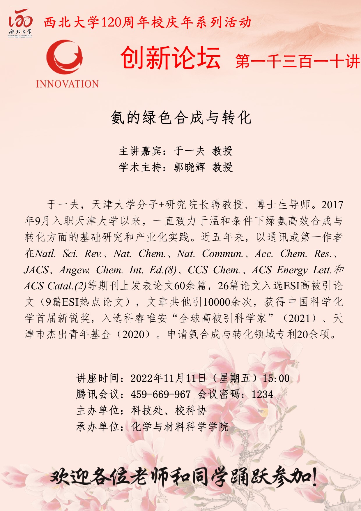 于一夫 教授 bat365正版唯一官网创新论坛第一千三百一十讲暨120周年校庆年系列活动: 氨的绿色合成与转化 讲座时间 2022年11月11日(星期五)15:00 讲座地点 腾讯会议(459-669-967) 密码 1234 讲座人介绍 于一夫 教授 讲座内容