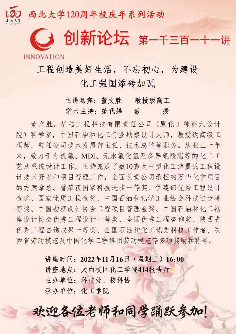 董文胜 教授级高工 bat365正版唯一官网创新论坛第一千三百一十一讲暨120周年校庆年系列活动: 工程创造美好生活,不忘初心,为建设化工强国添砖加瓦 讲座时间 2022年11月16日(星期三)16:00 讲座地点 太白校区化工学院414报告厅 讲座人介绍 董文胜 教授级高工 讲座内容