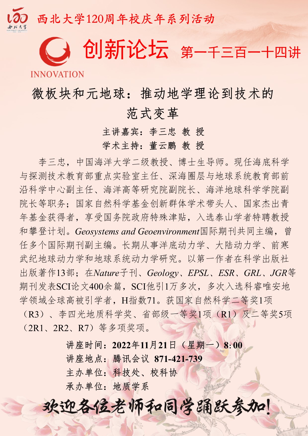 李三忠 教授 bat365正版唯一官网创新论坛第一千三百一十四讲暨120周年校庆年系列活动: 微板块和元地球:推动地学理论到技术的范式变革 讲座时间 2022年11月21日(星期一)8:00 讲座地点 腾讯会议(871-421-739) 讲座人介绍 李三忠 教授 讲座内容