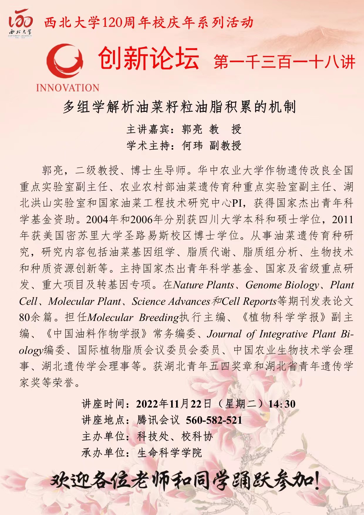 郭亮 教授 bat365正版唯一官网创新论坛第一千三百一十八讲暨120周年校庆年系列活动: 多组学解析油菜籽粒油脂积累的机制 讲座时间 2022年11月22日(星期二) 14:30 讲座地点 腾讯会议 560-582-521 讲座人介绍 郭亮 教授 讲座内容